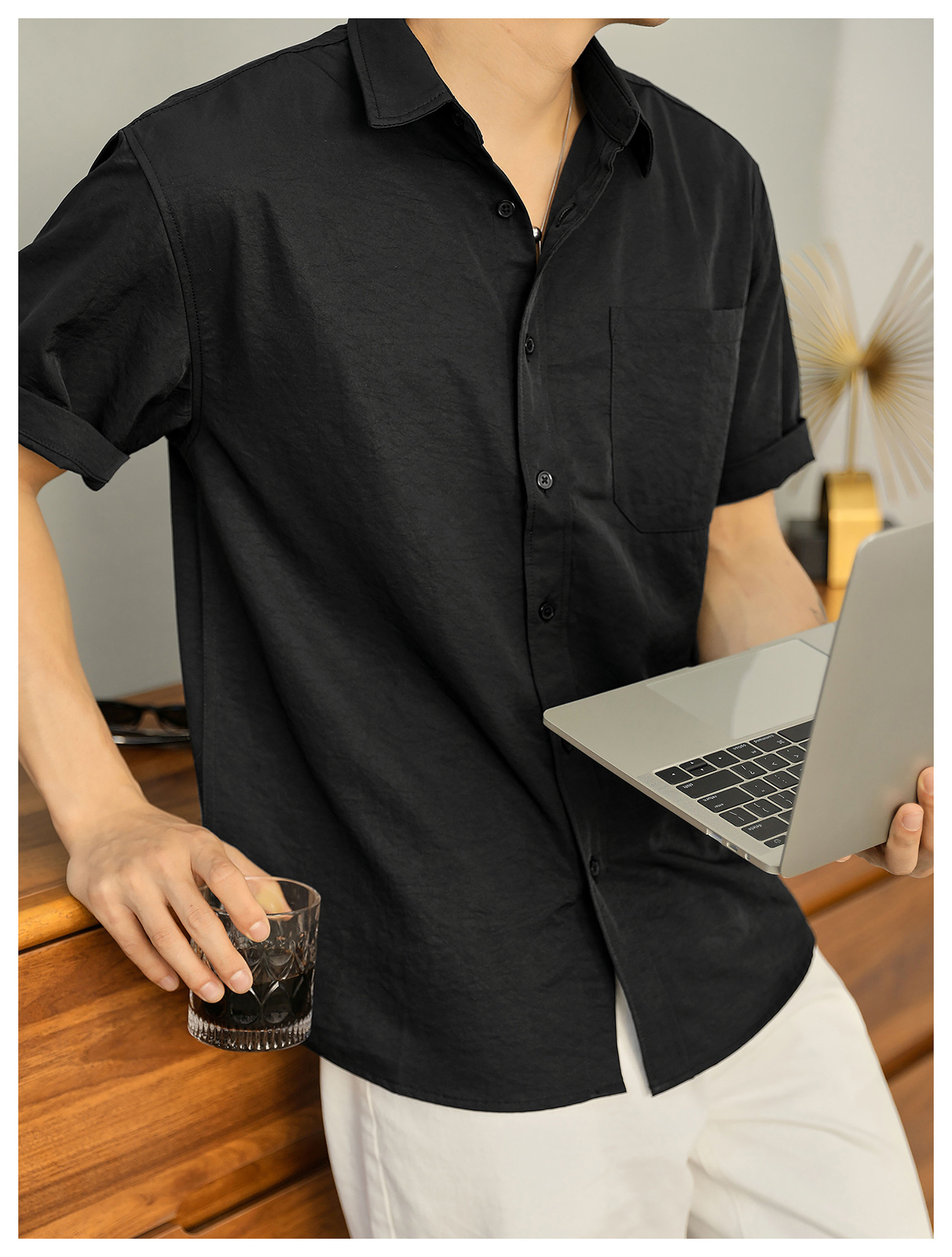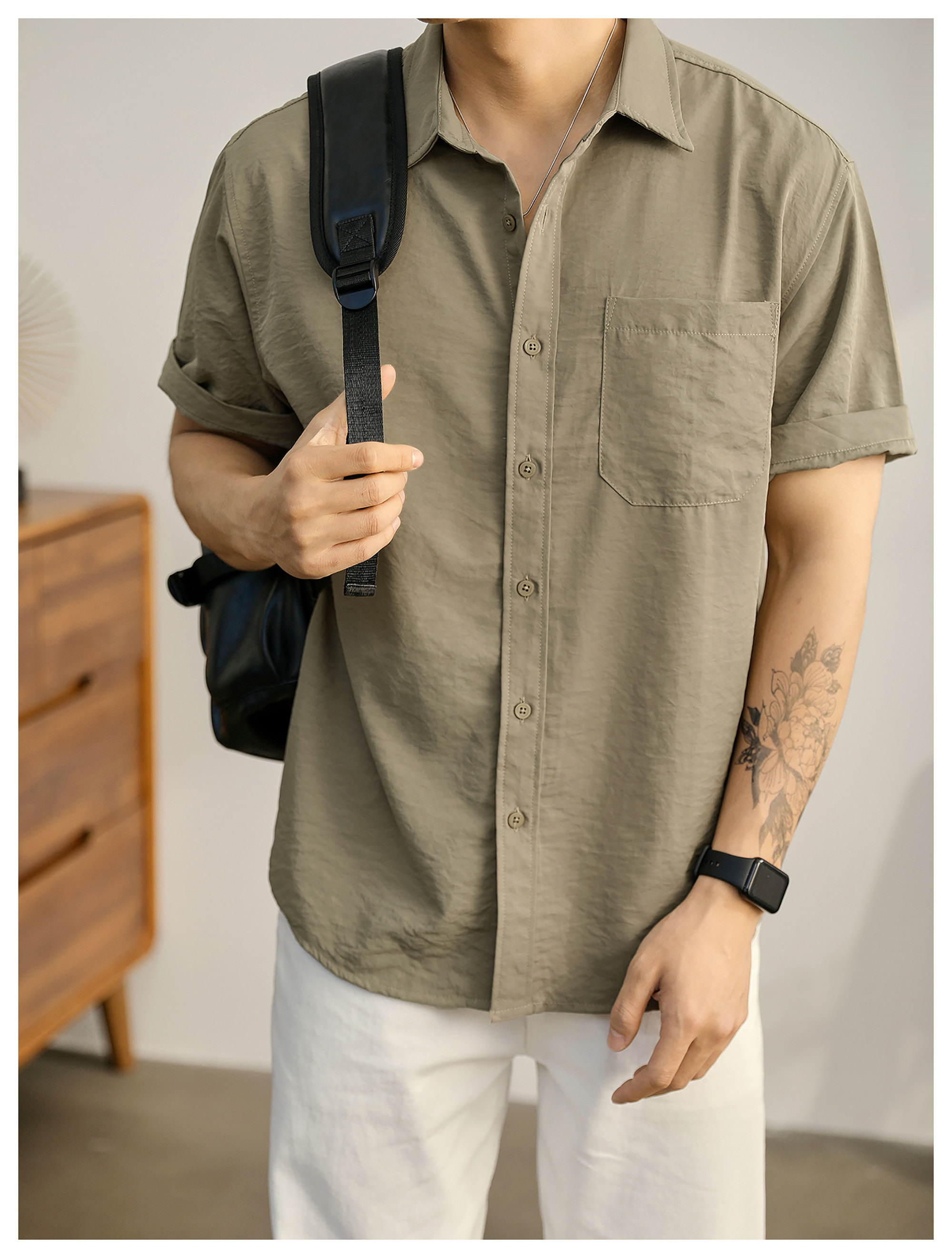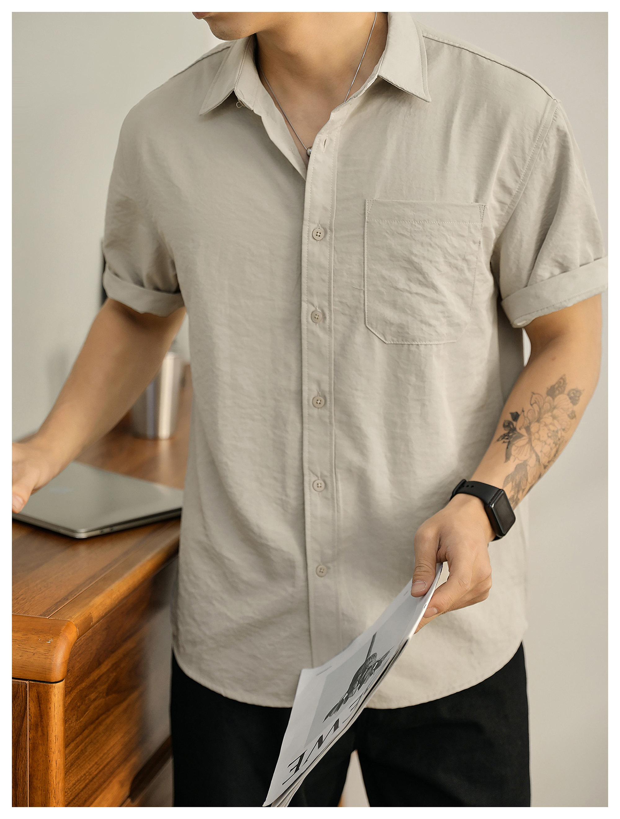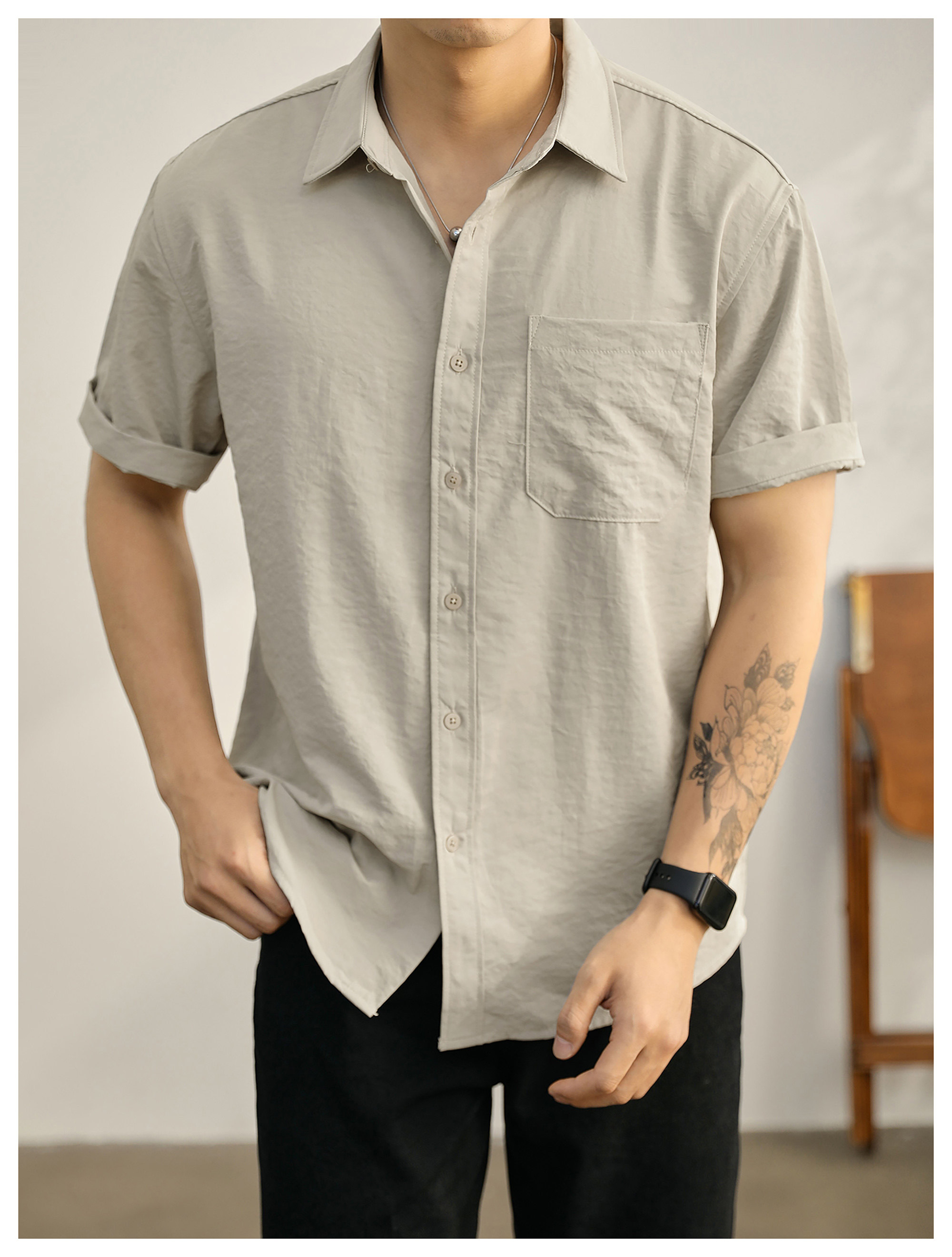 都市休闲感白色净版短袖衬衣男士夏季胸口贴袋圆弧下摆衬衫