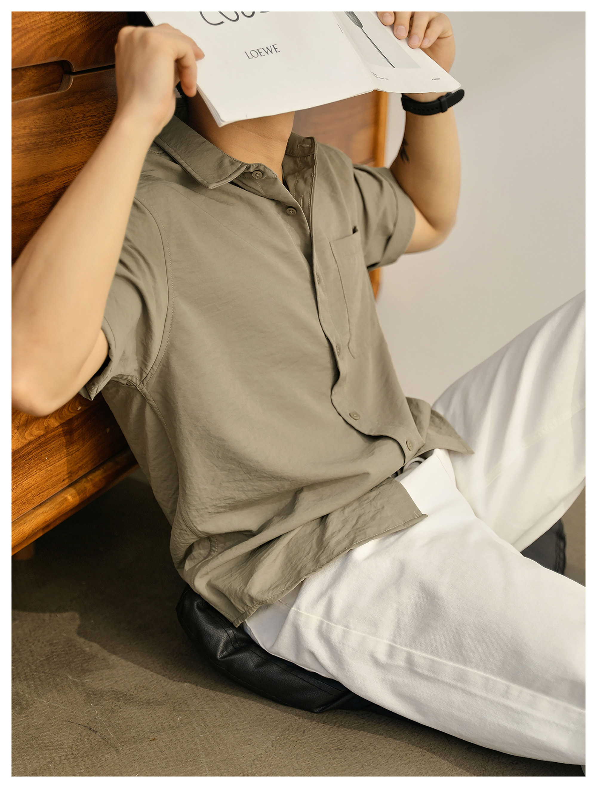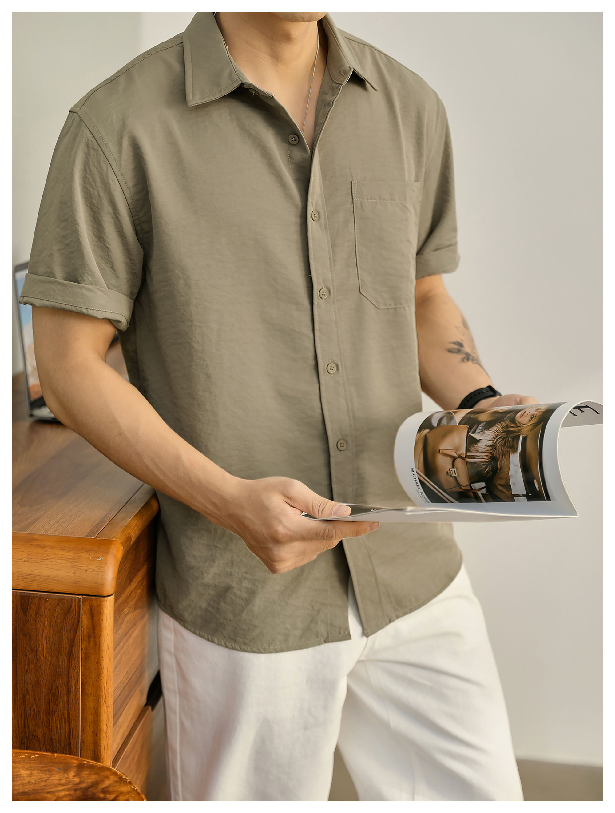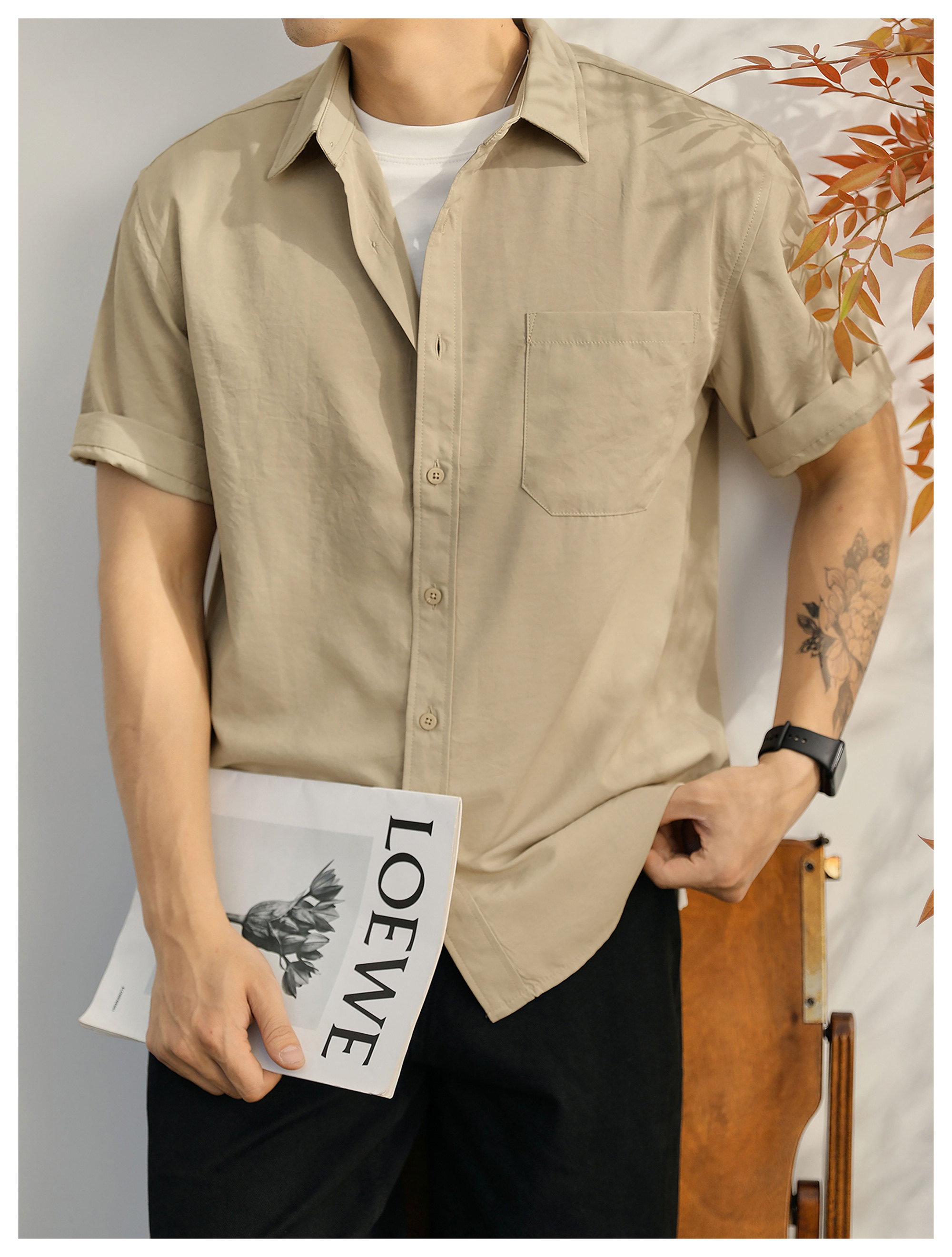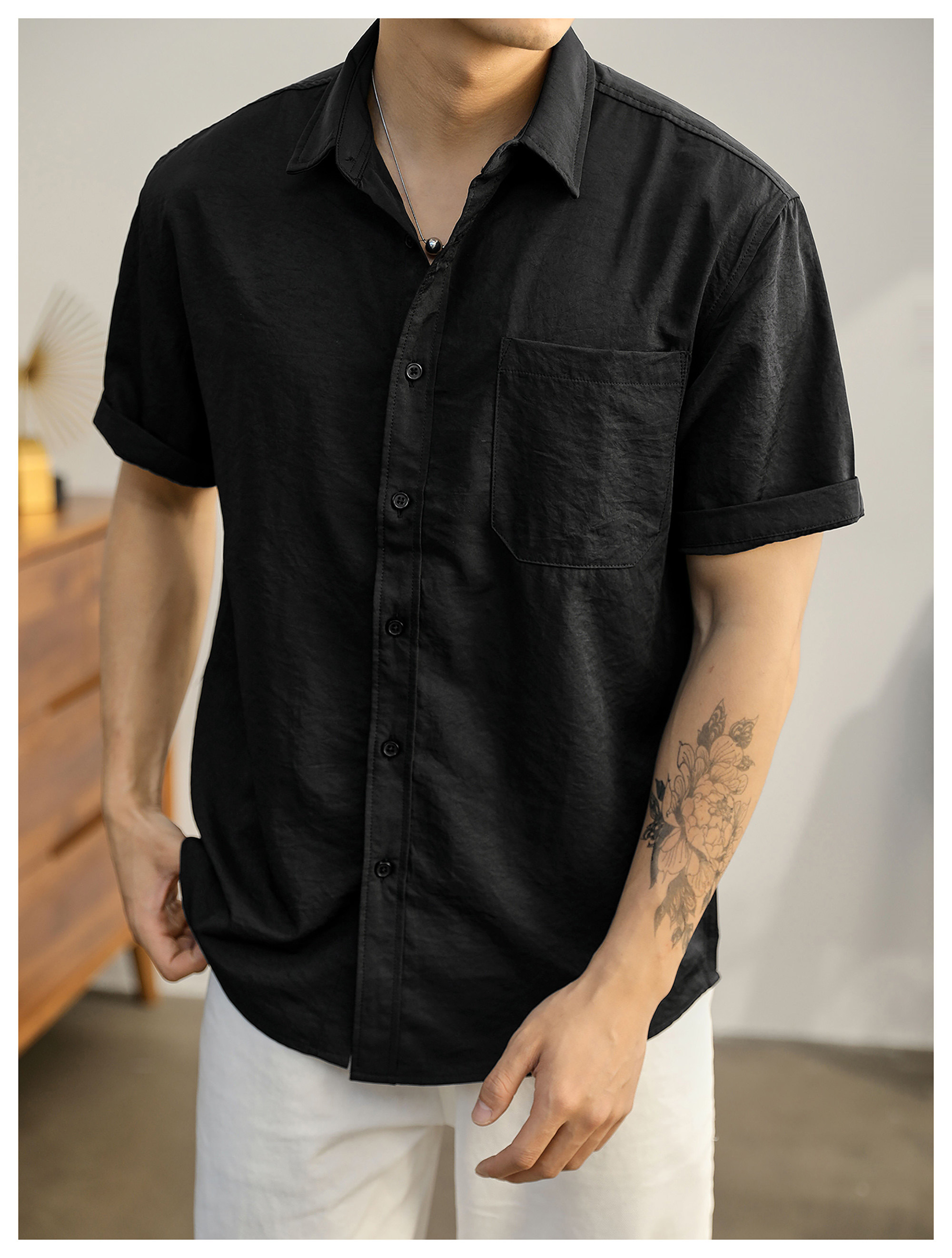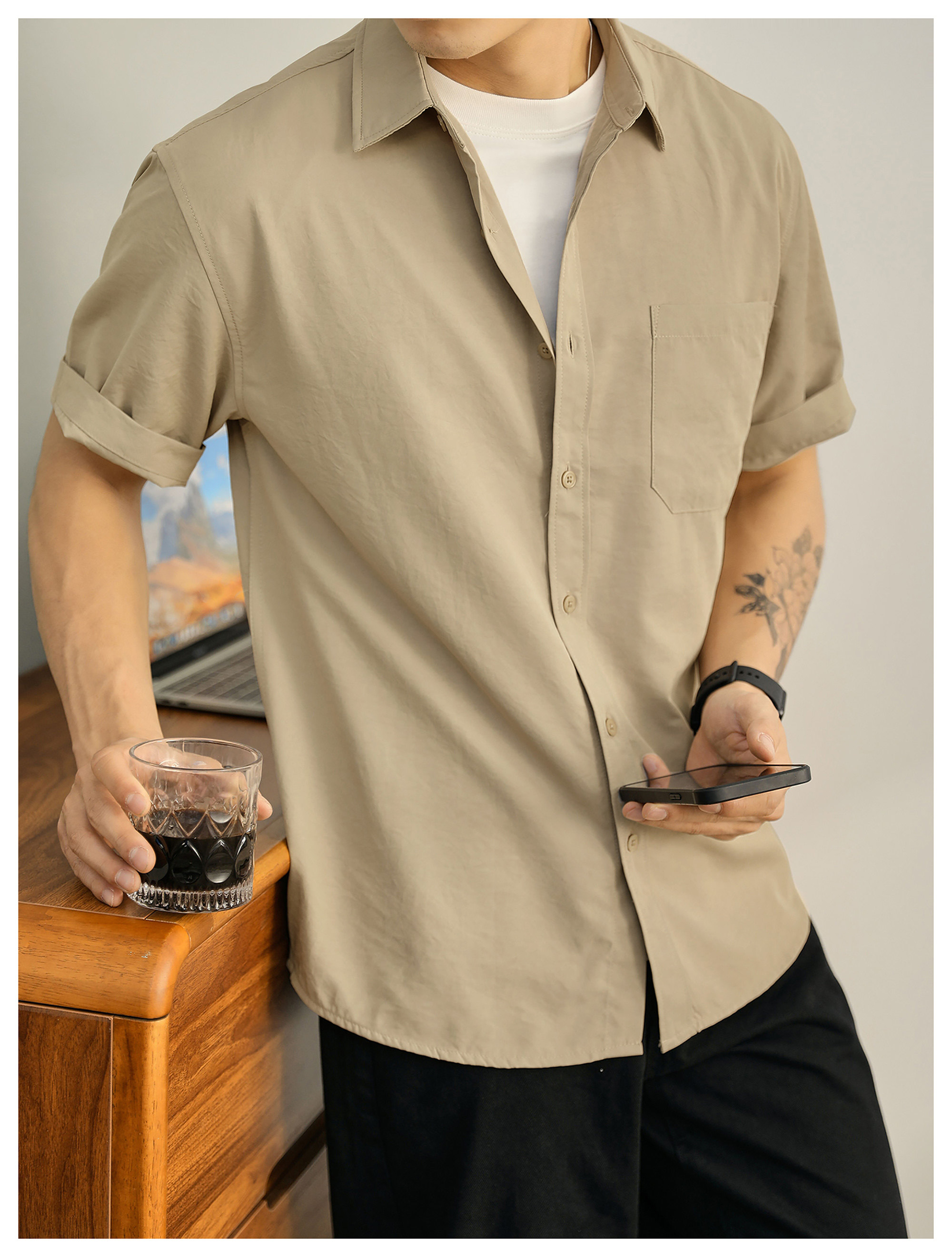 都市休闲感白色净版短袖衬衣男士夏季胸口贴袋圆弧下摆衬衫
