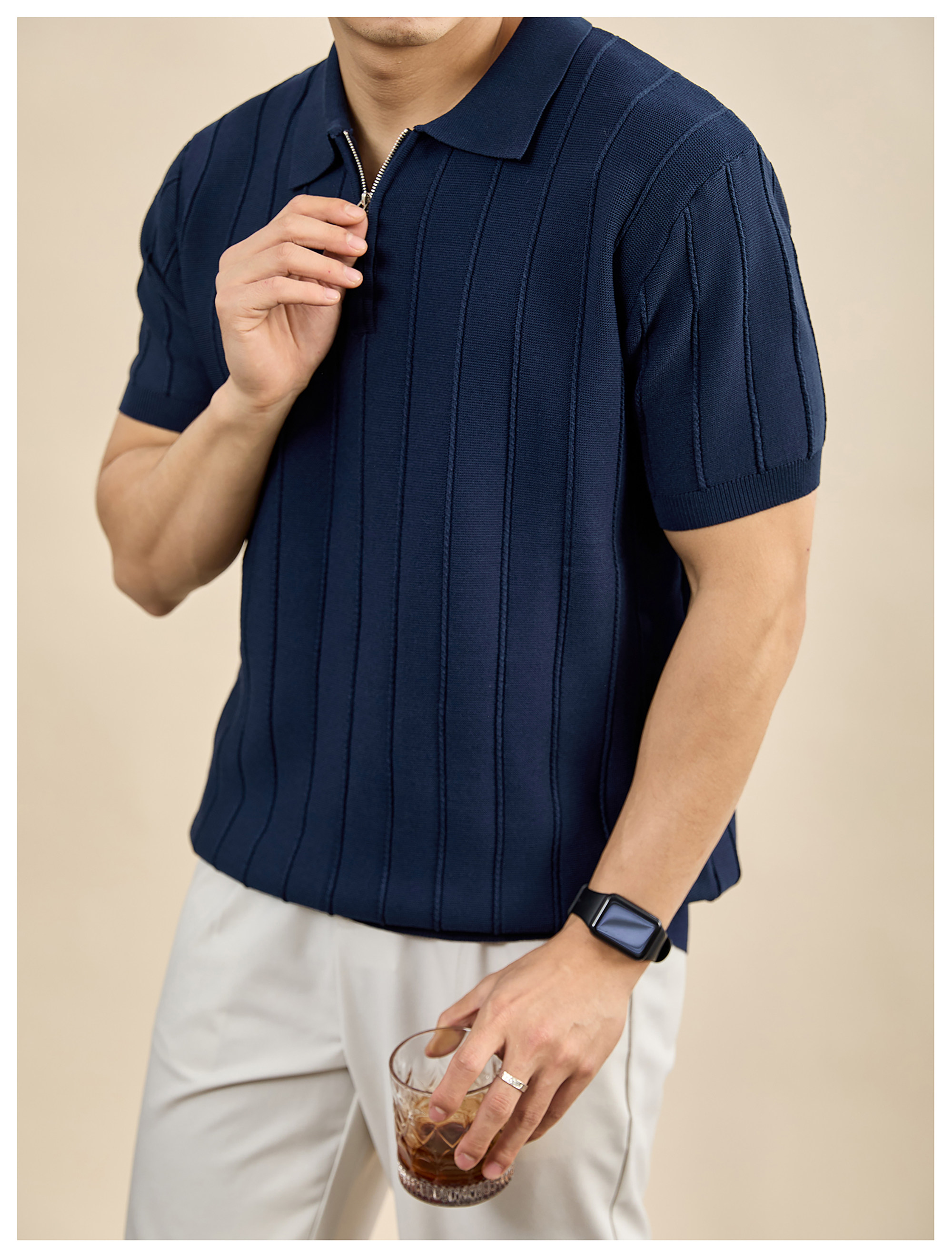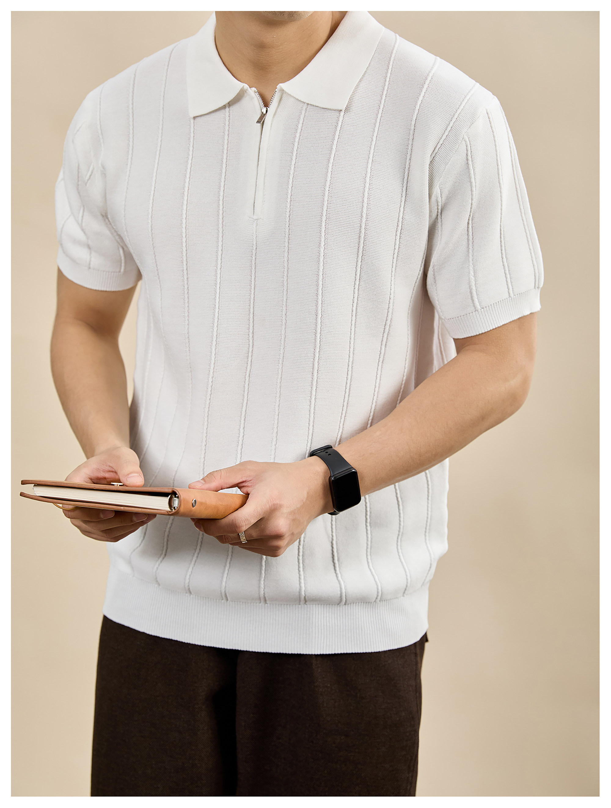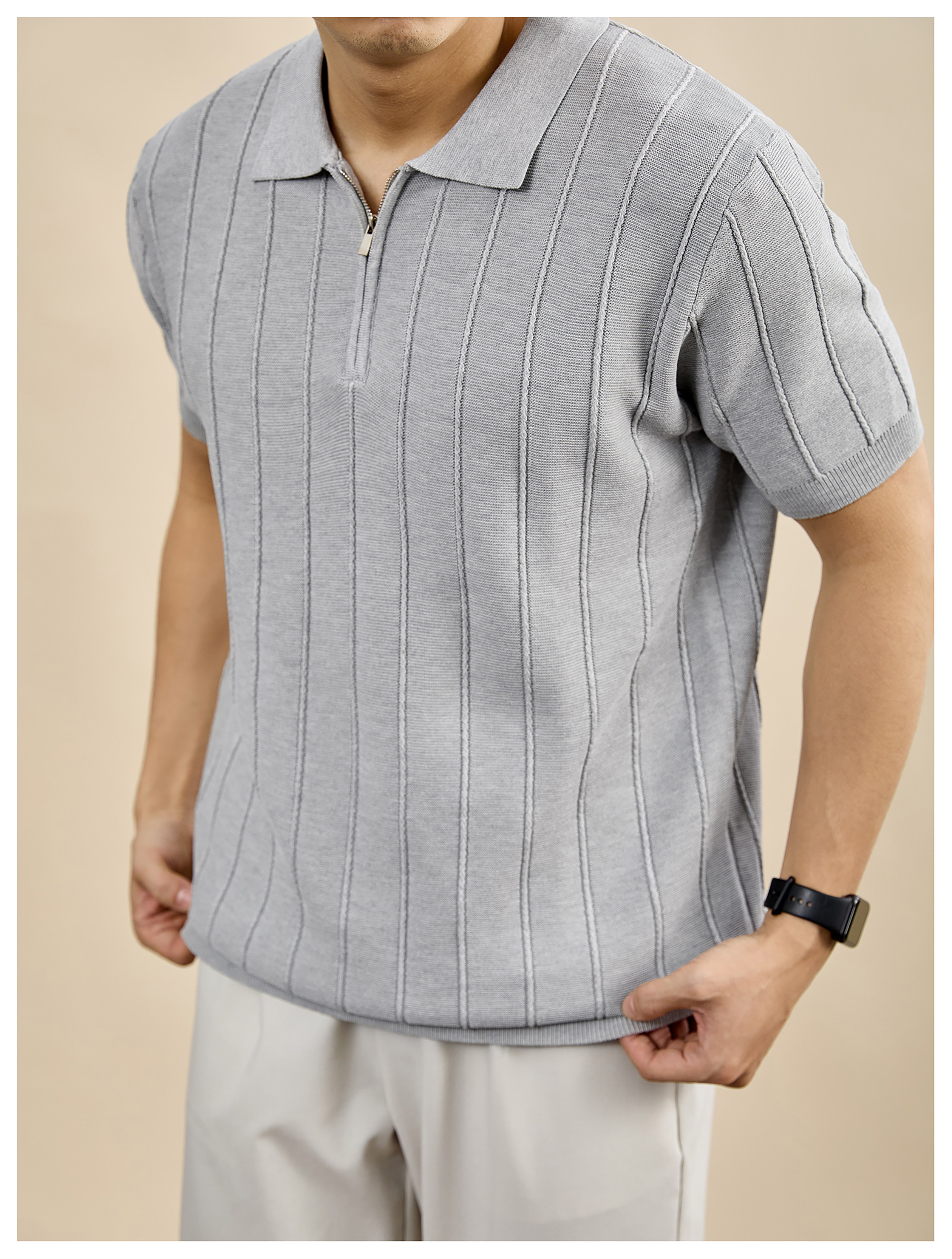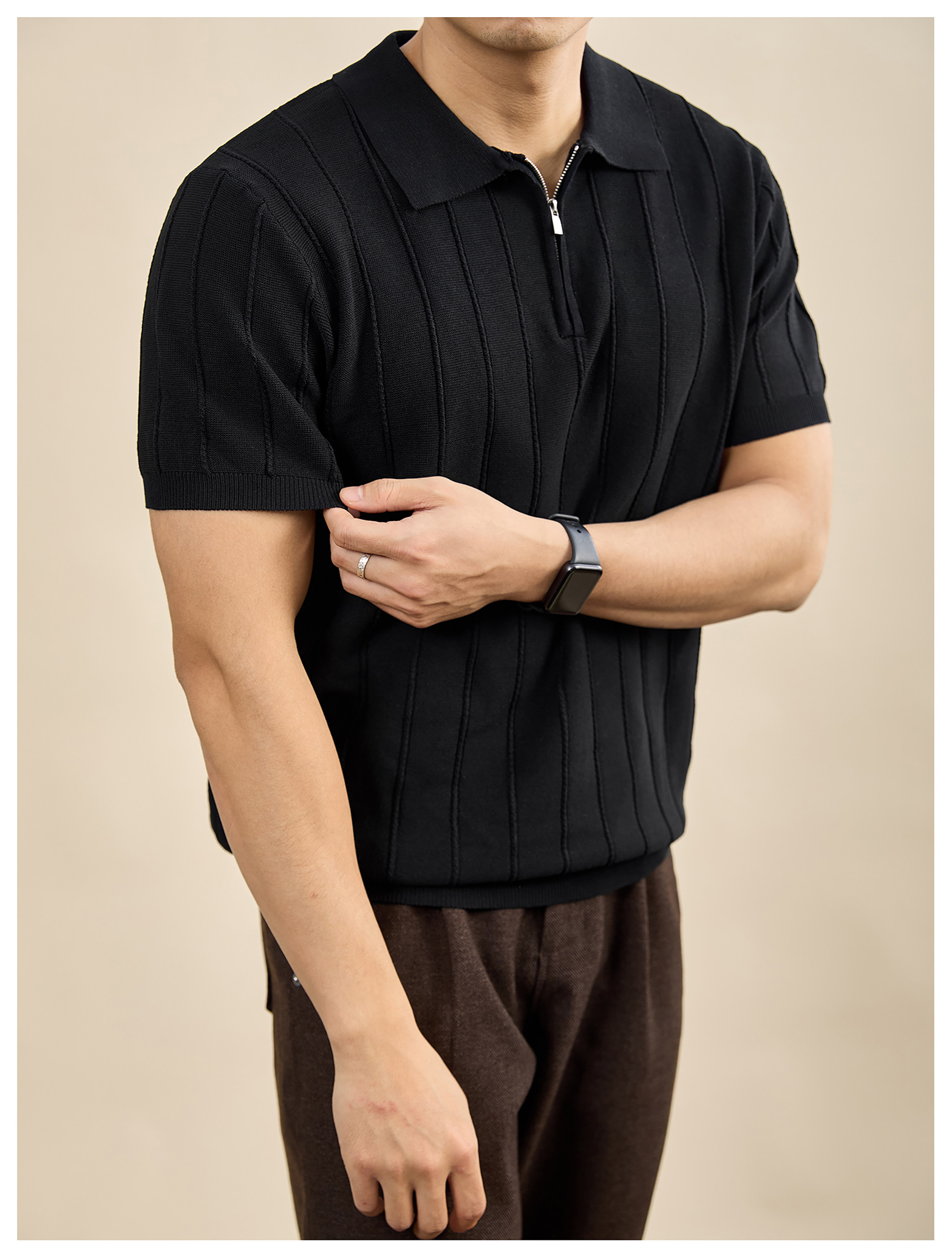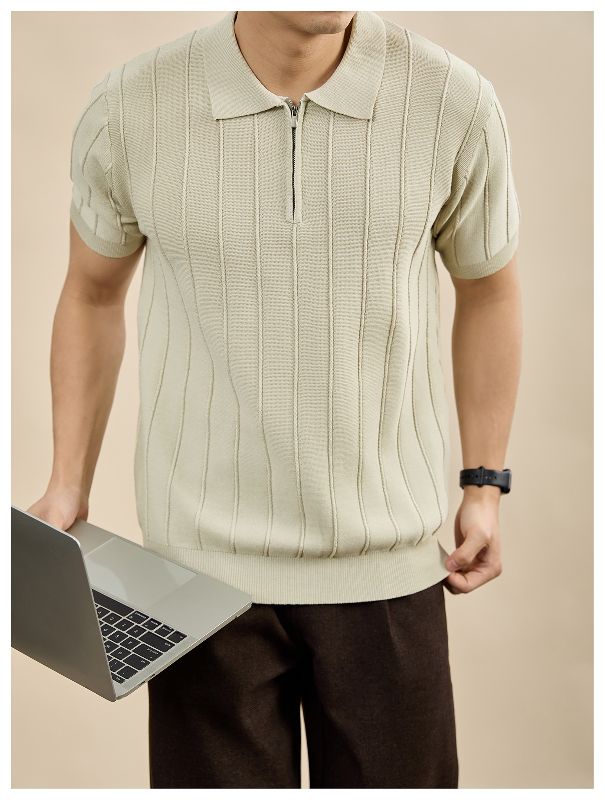 都市通勤透氣針織POLO衫男夏季立體豎條肌理半拉鍊翻領短袖