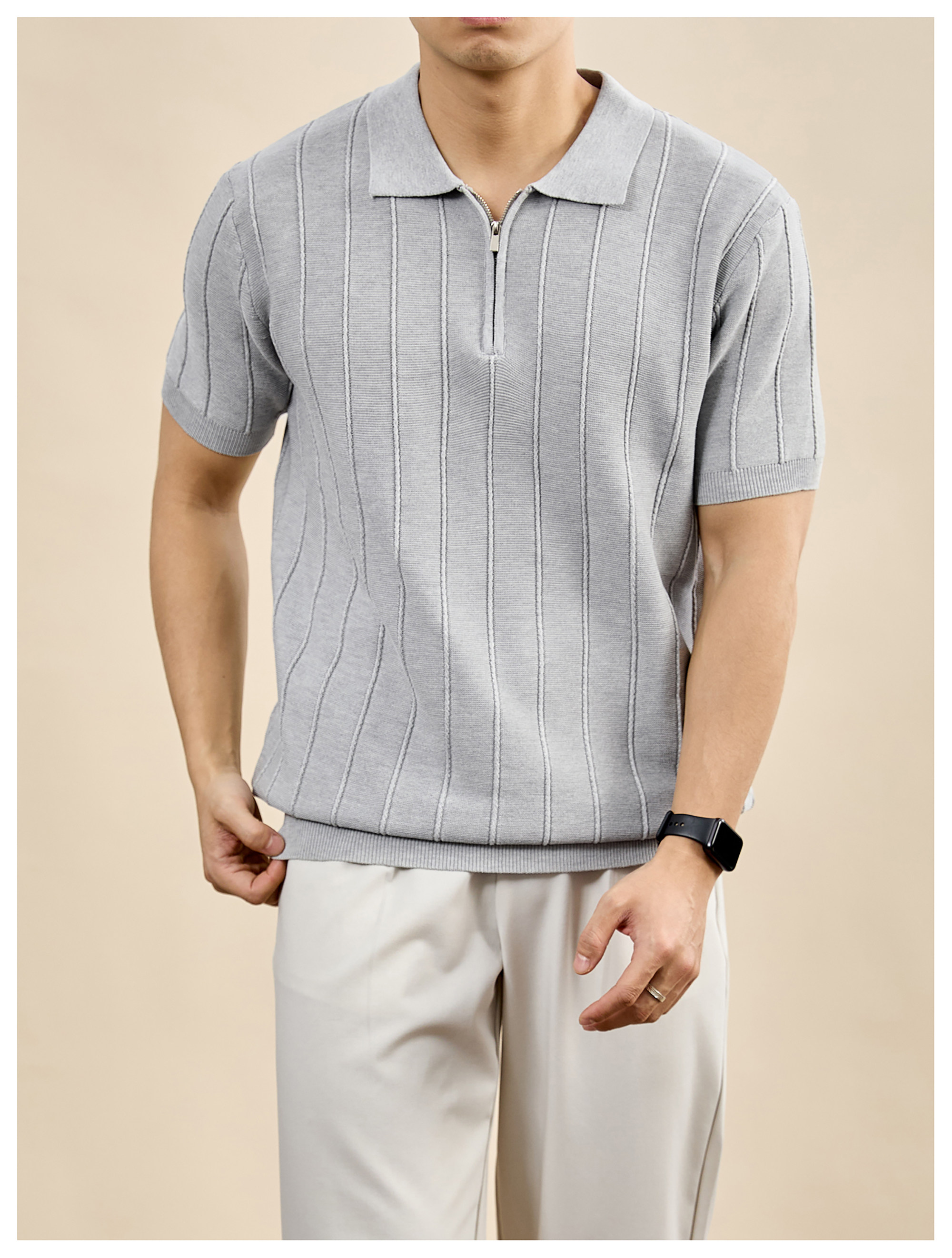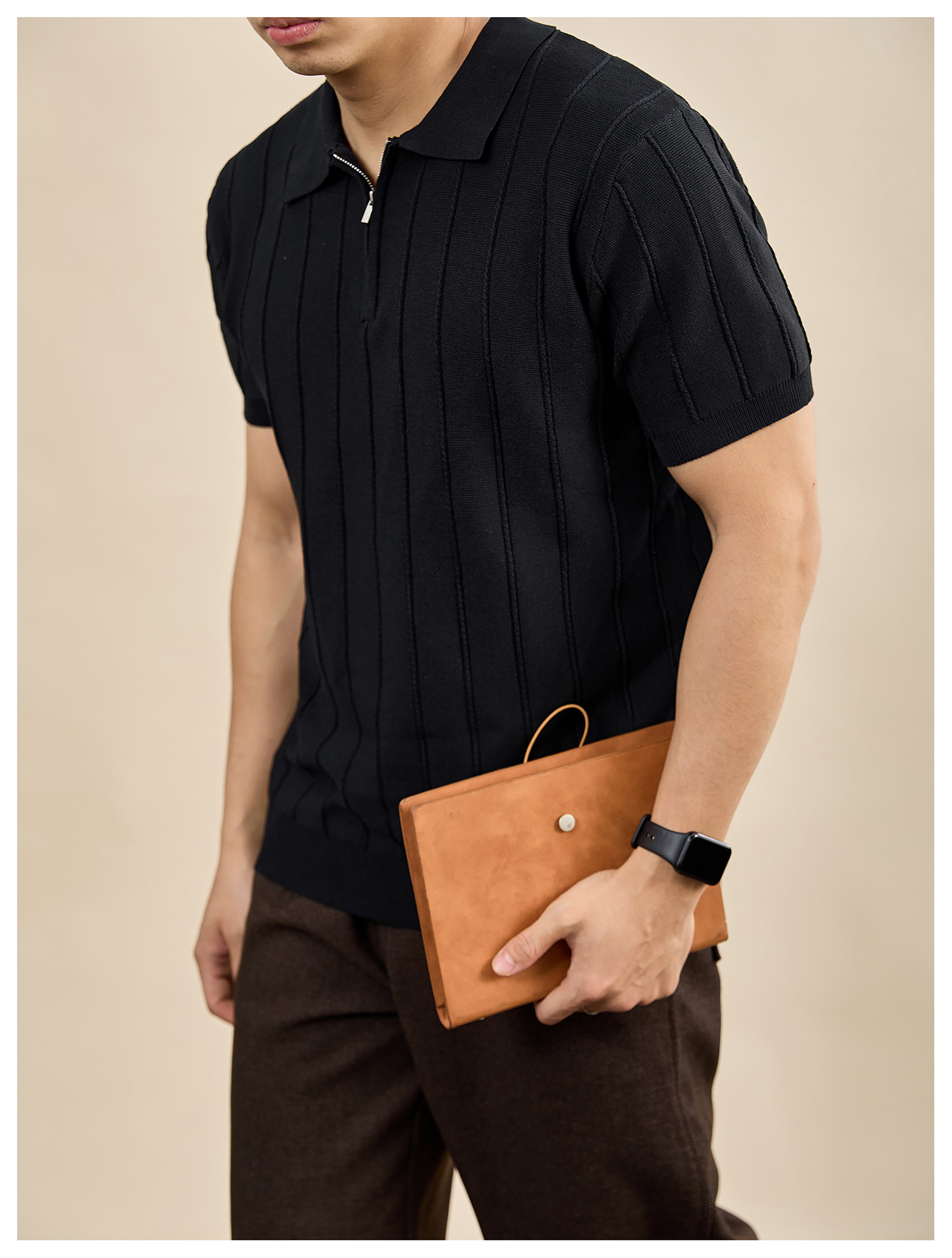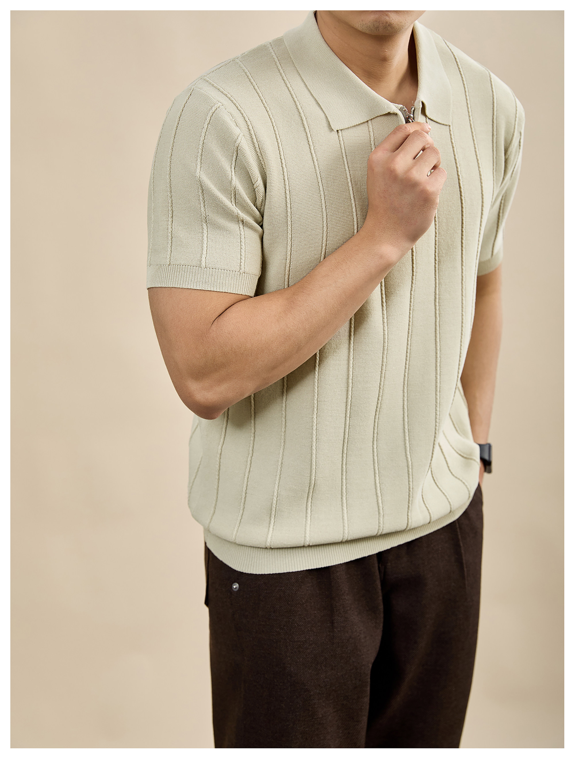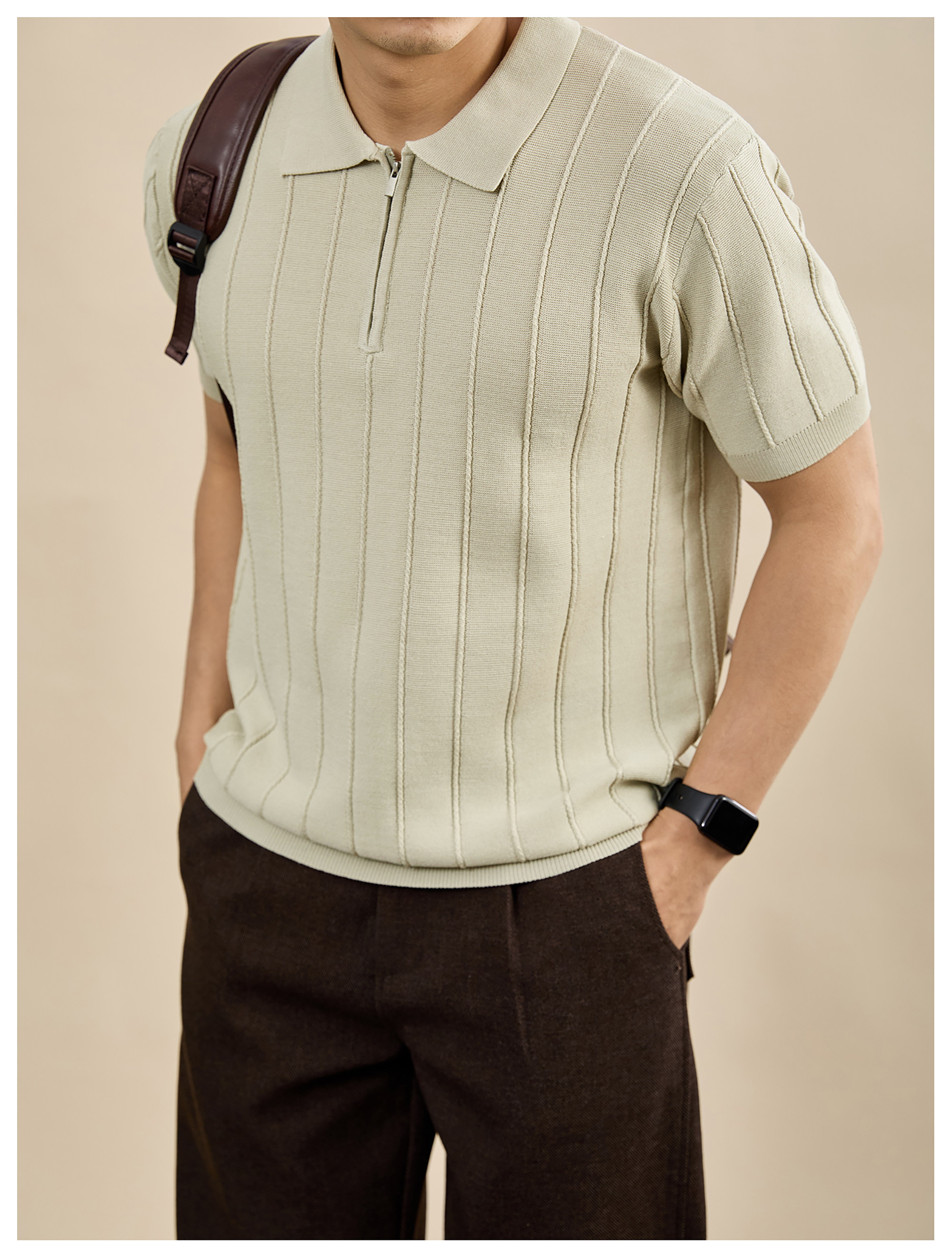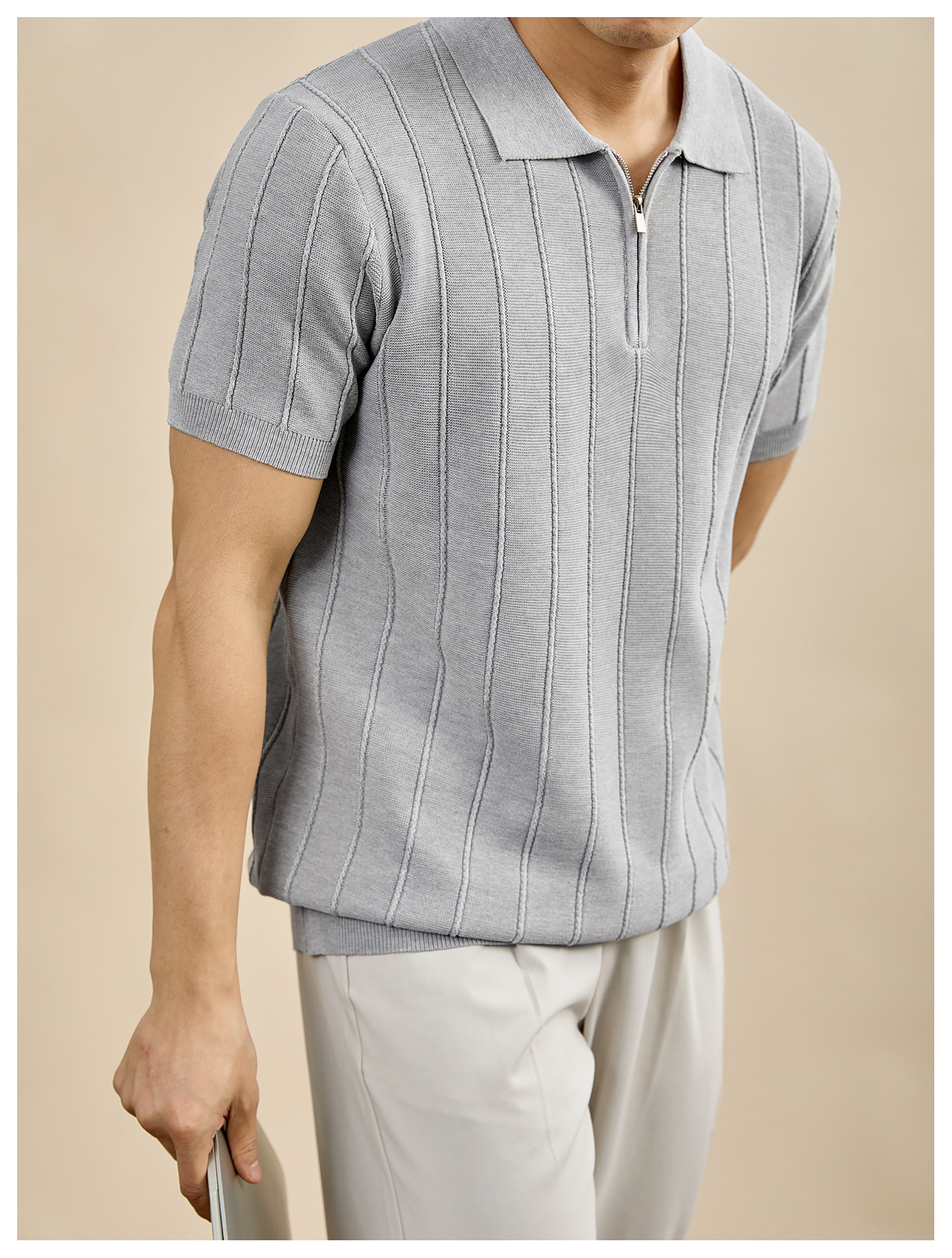 都市通勤透氣針織POLO衫男夏季立體豎條肌理半拉鍊翻領短袖