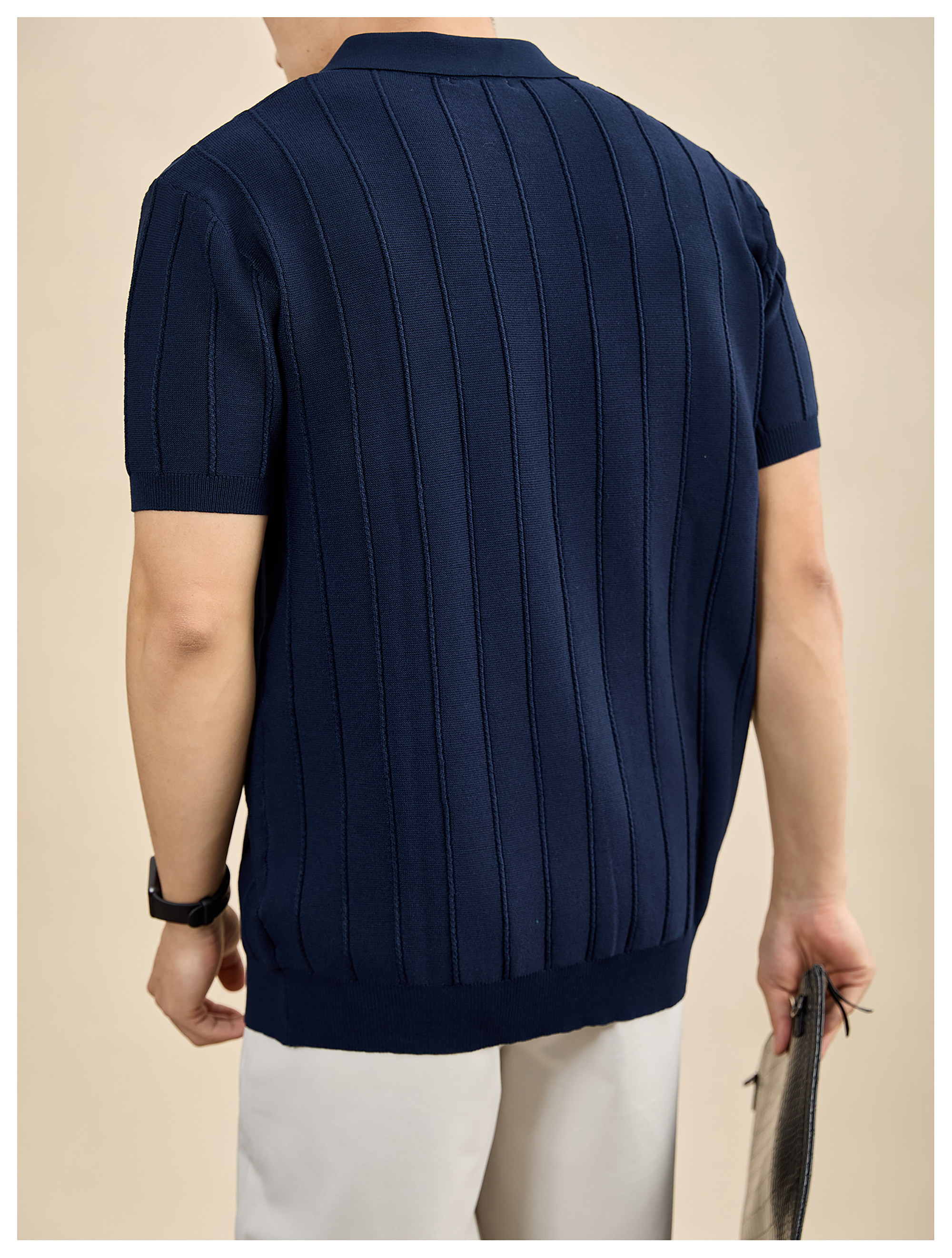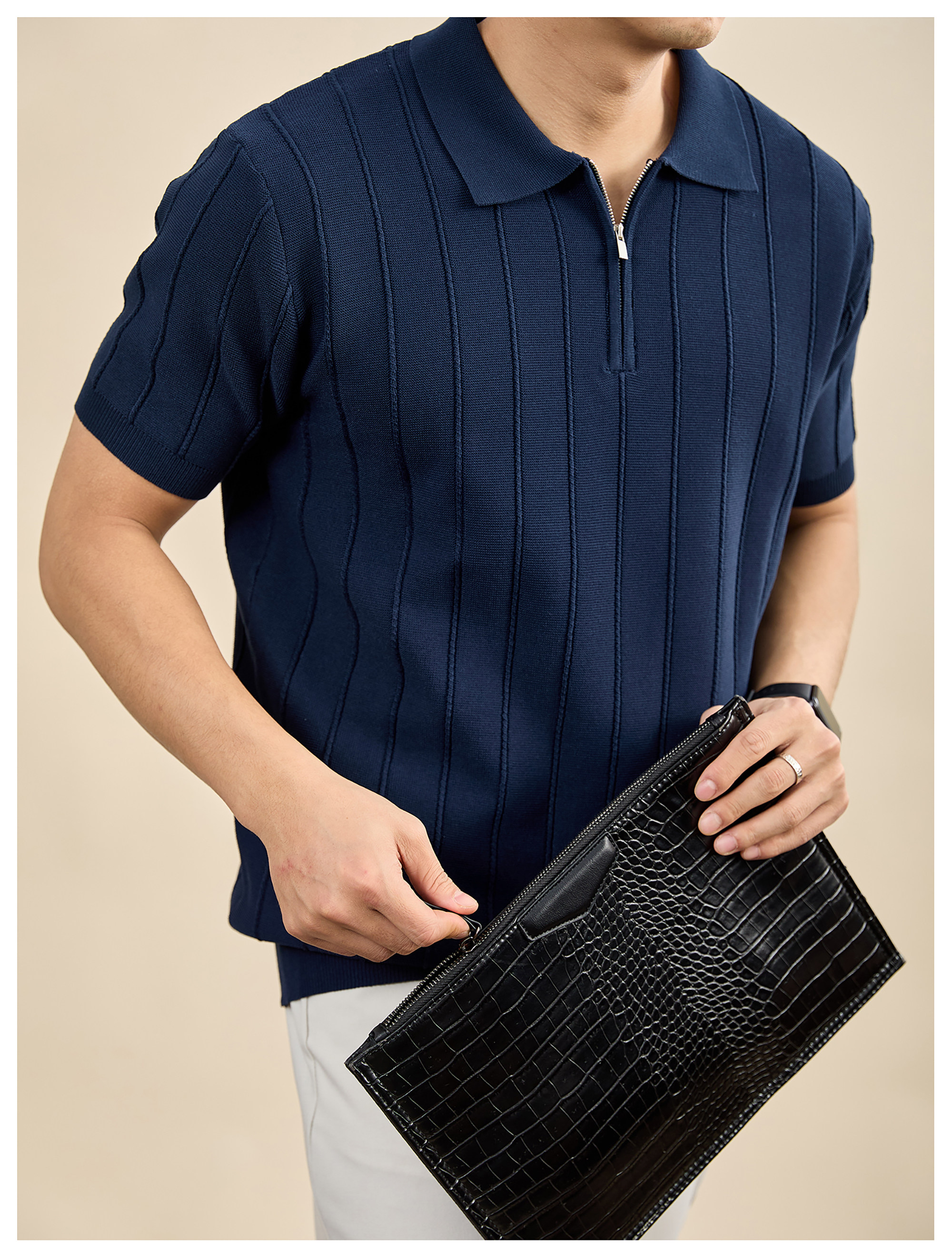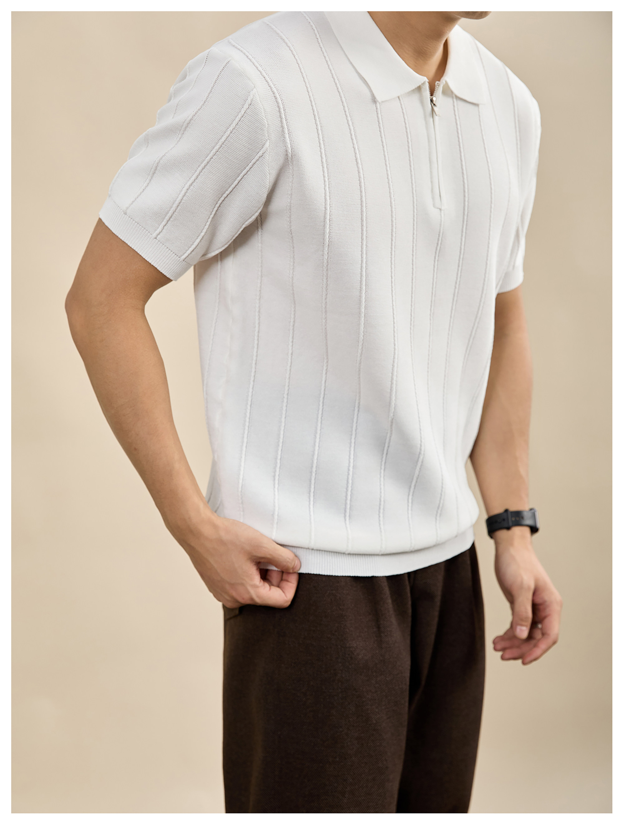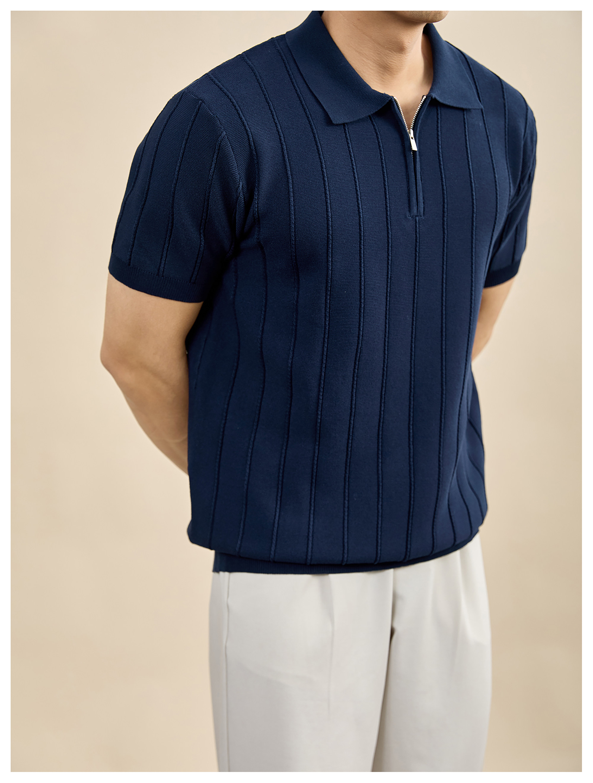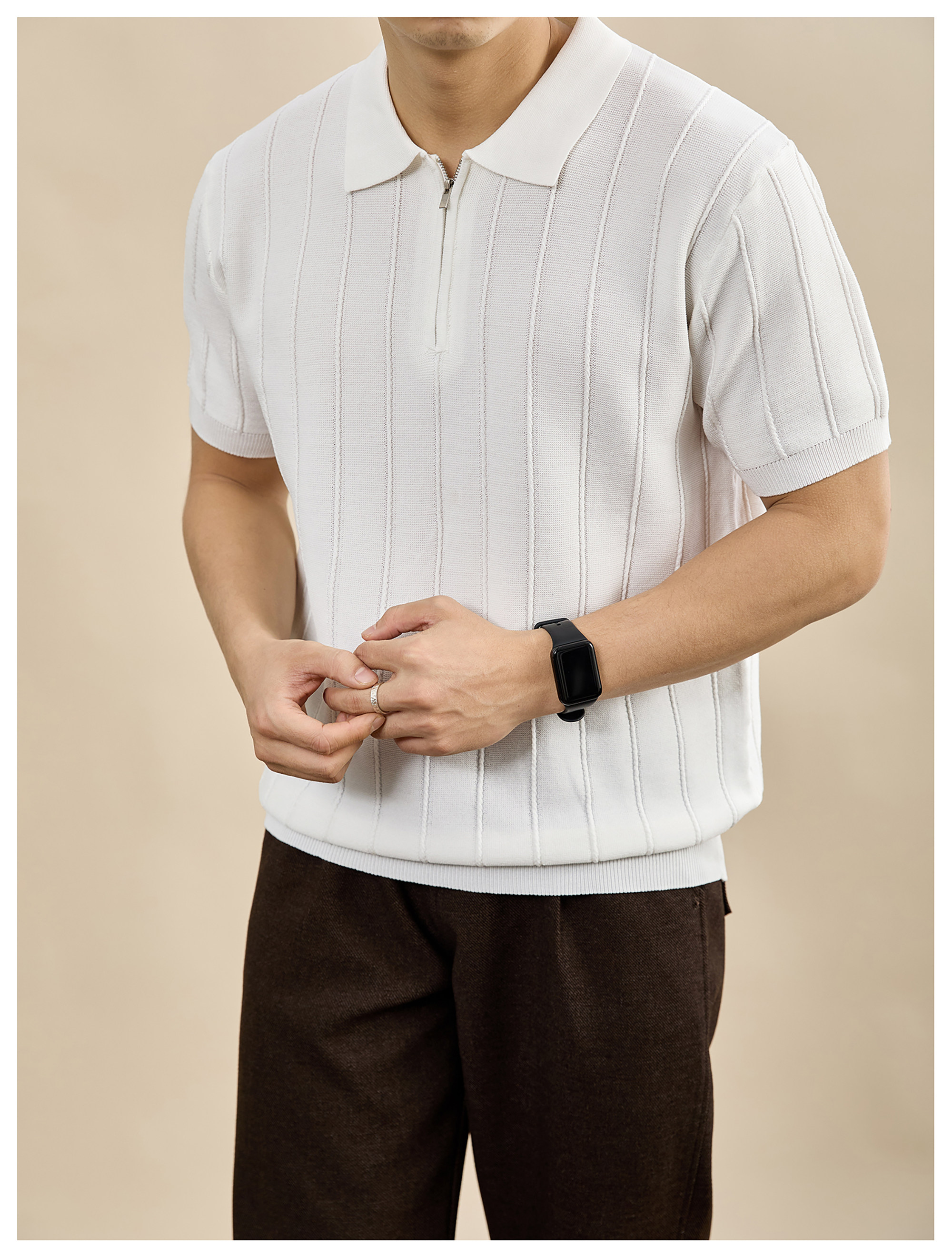 都市通勤透氣針織POLO衫男夏季立體豎條肌理半拉鍊翻領短袖