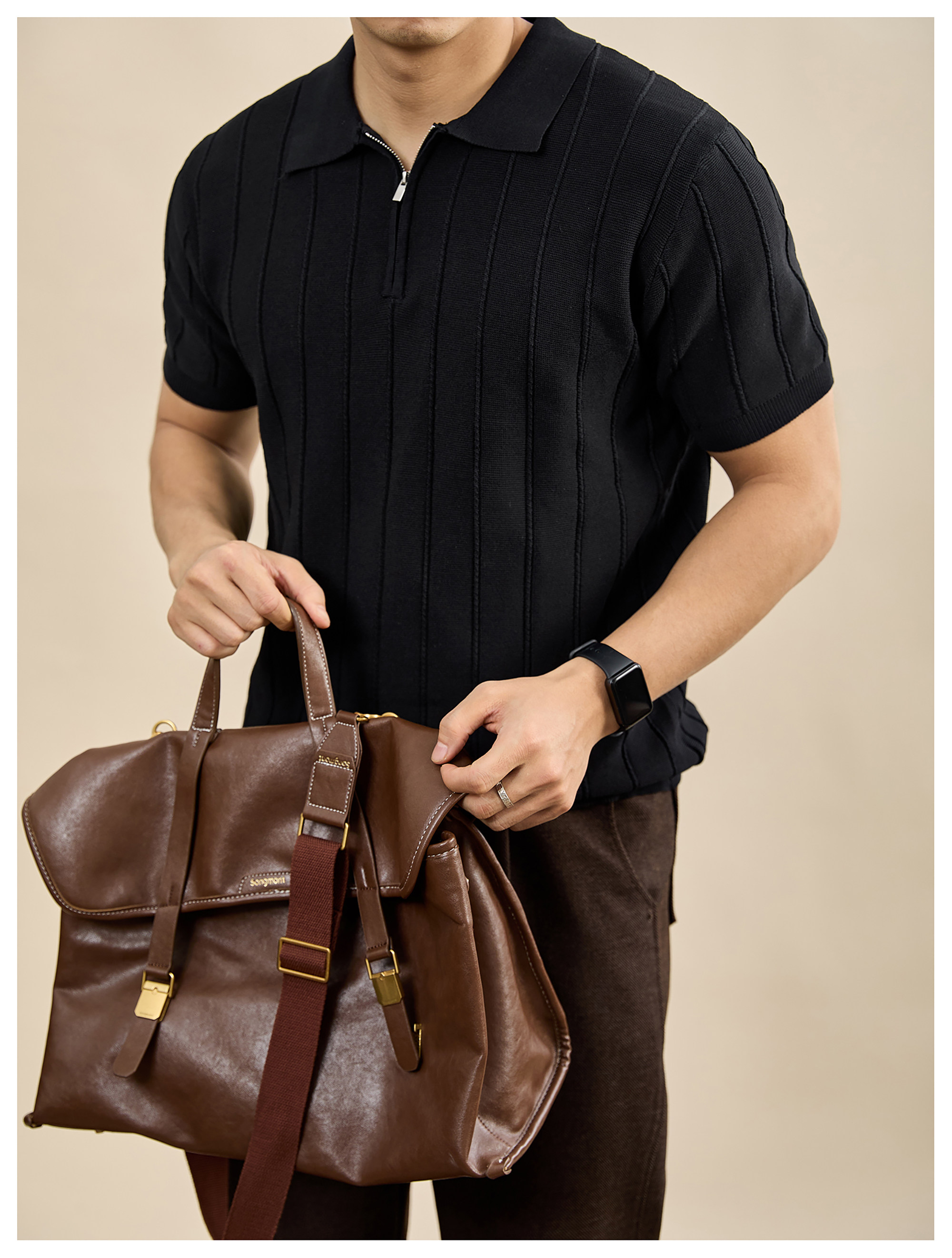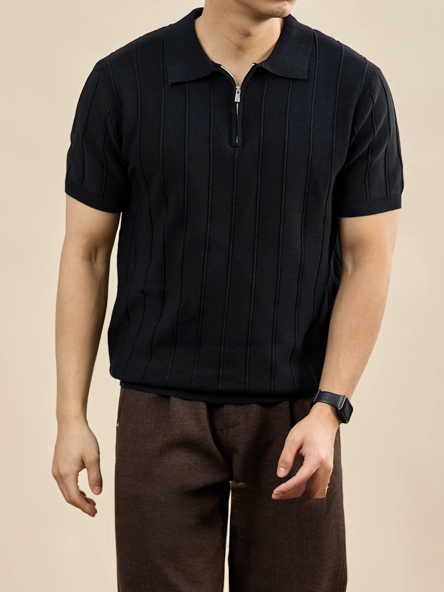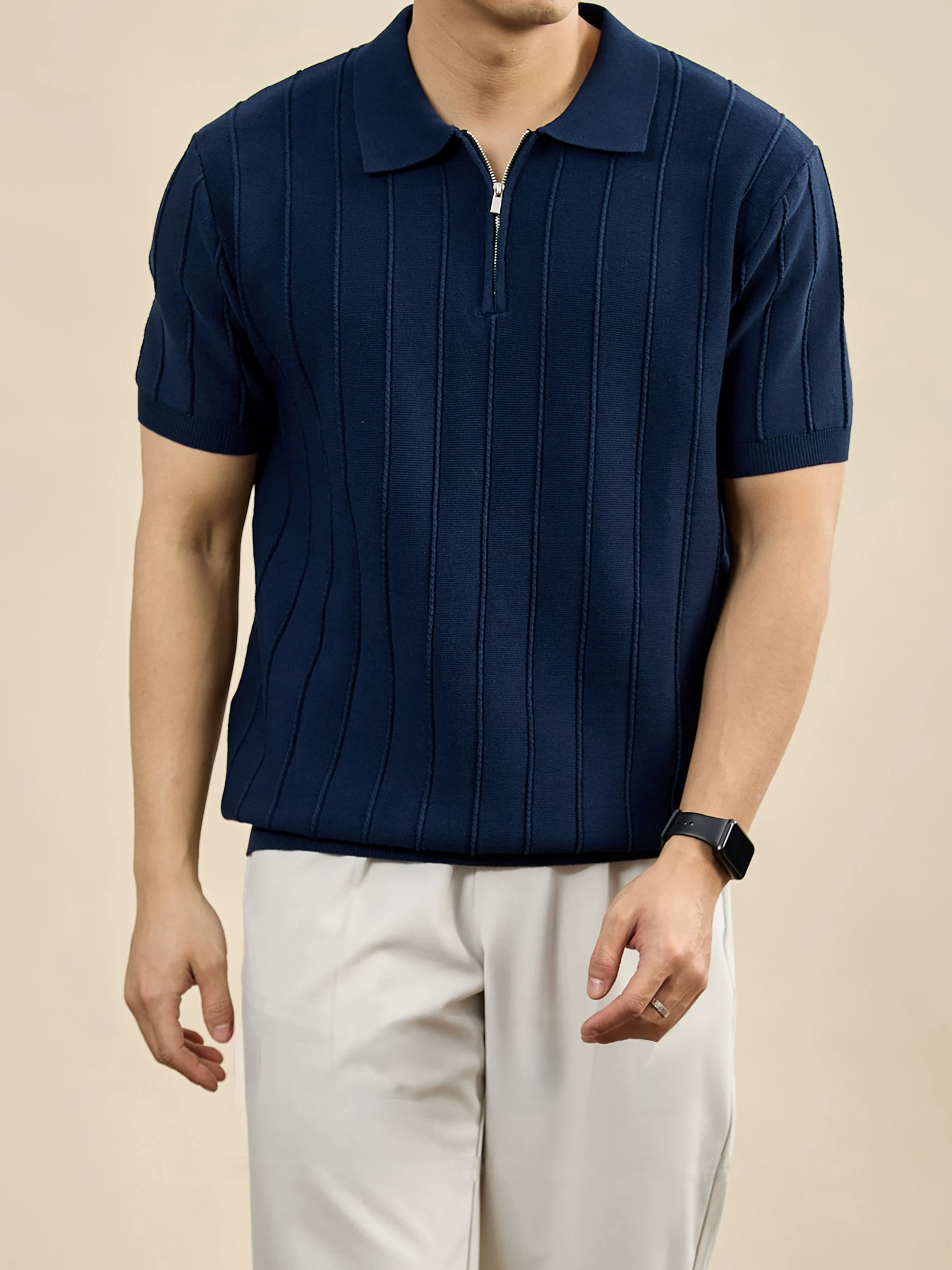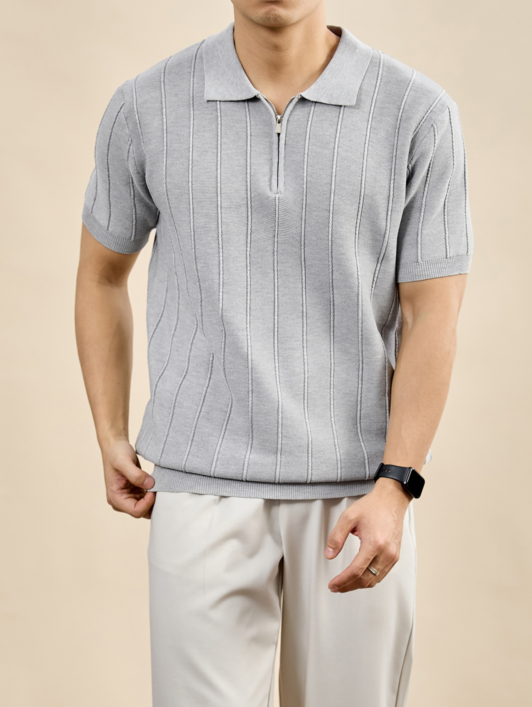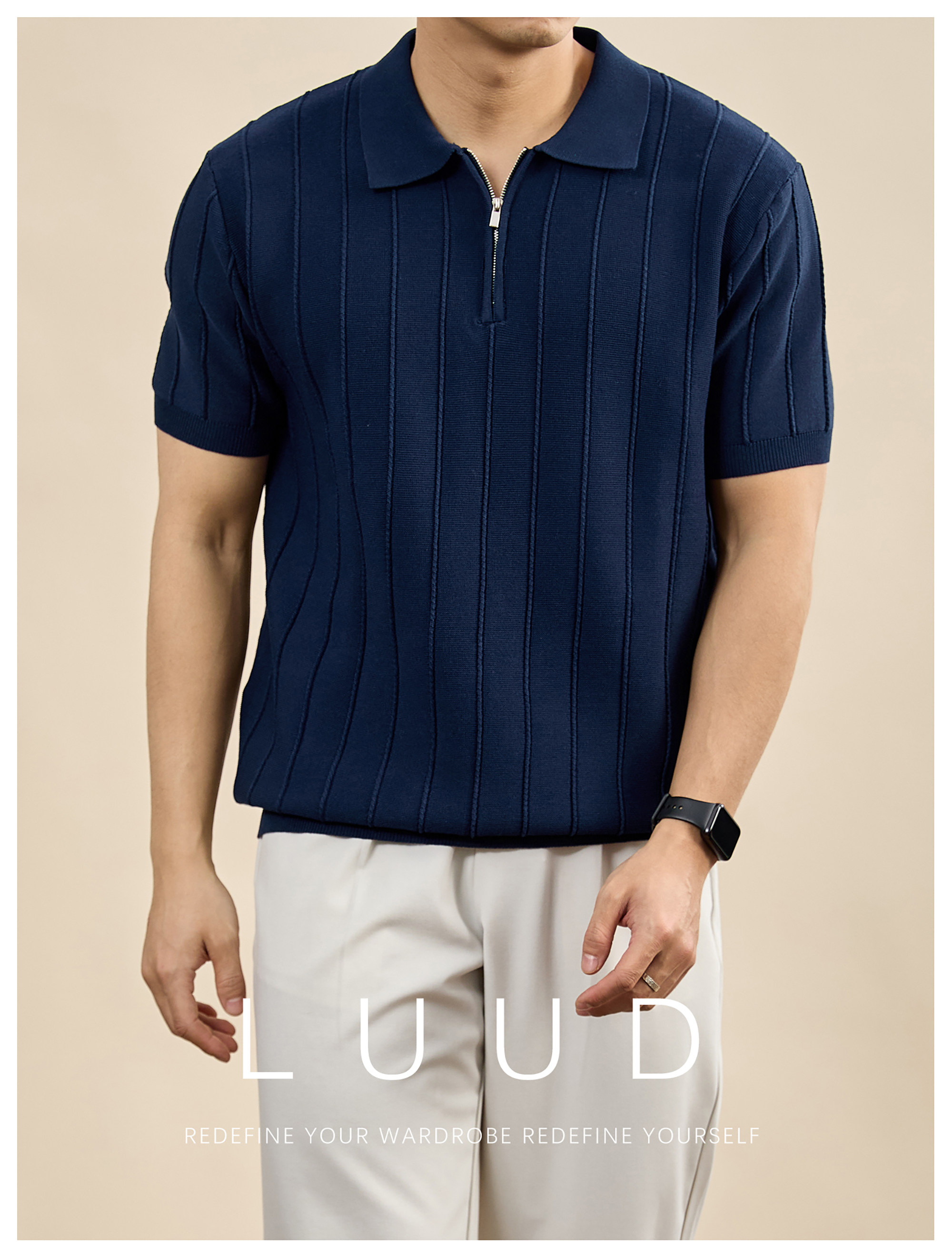 都市通勤透氣針織POLO衫男夏季立體豎條肌理半拉鍊翻領短袖
