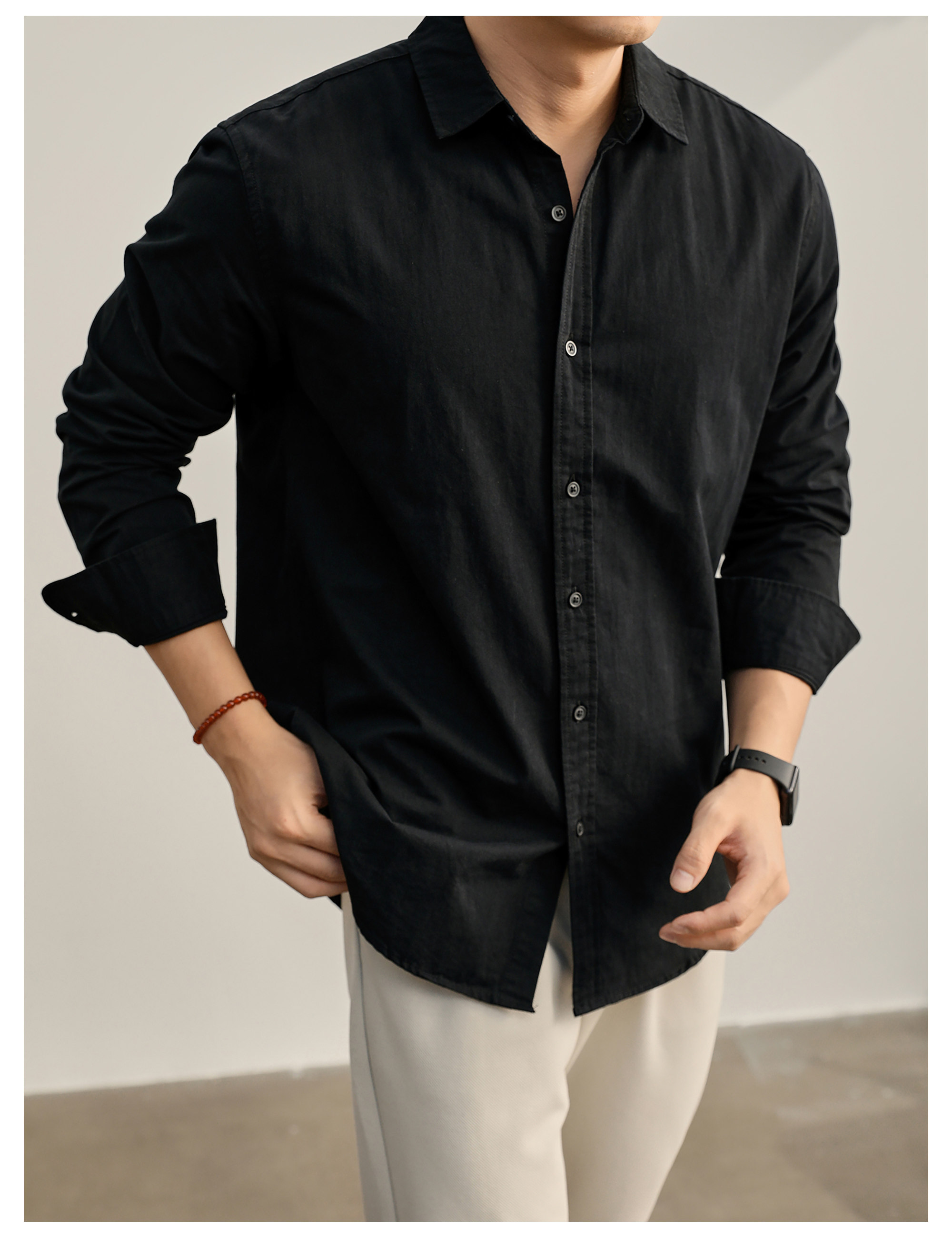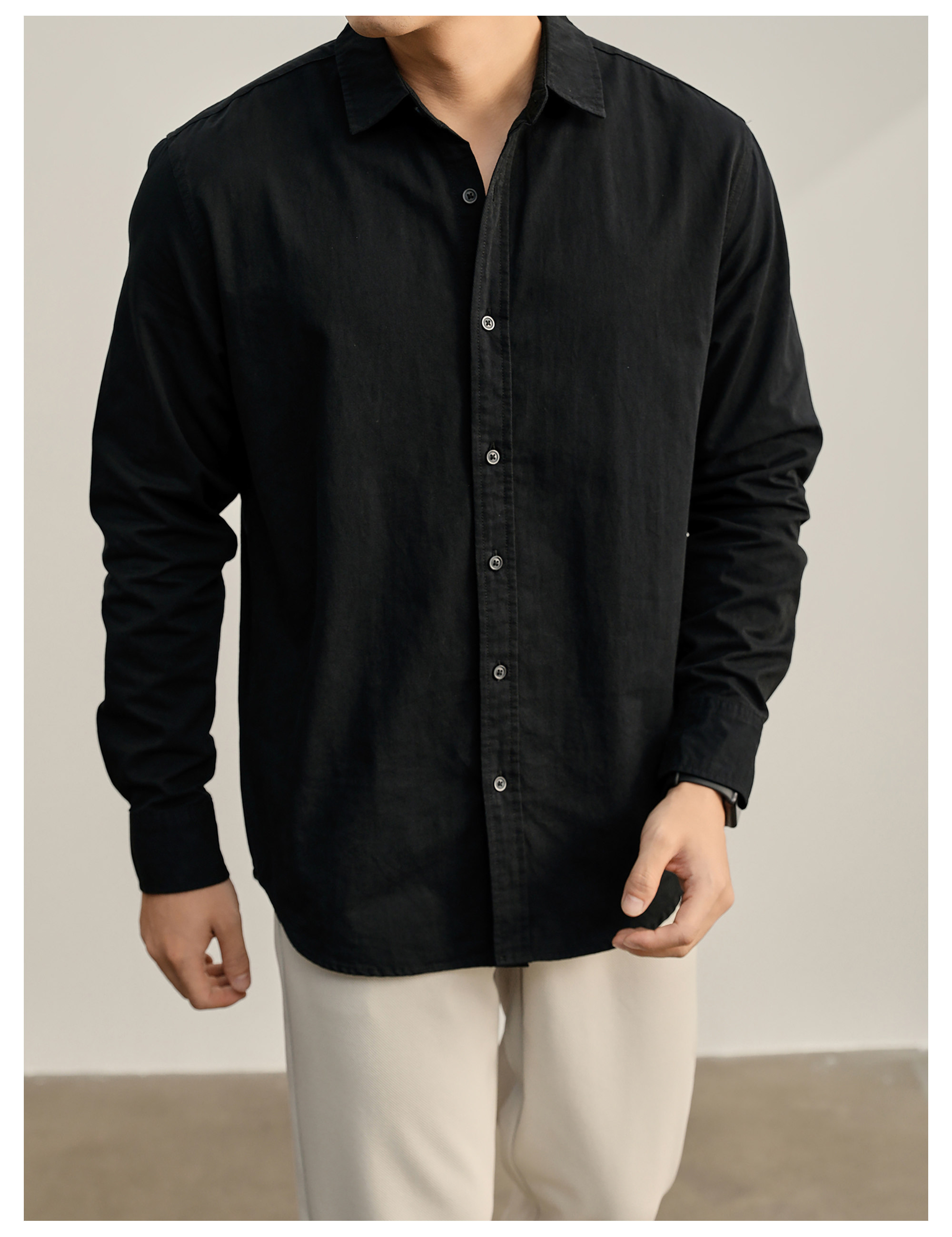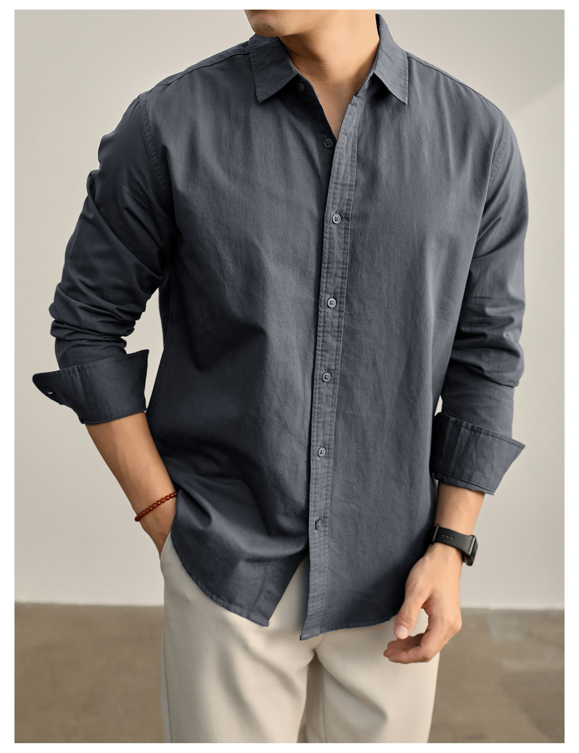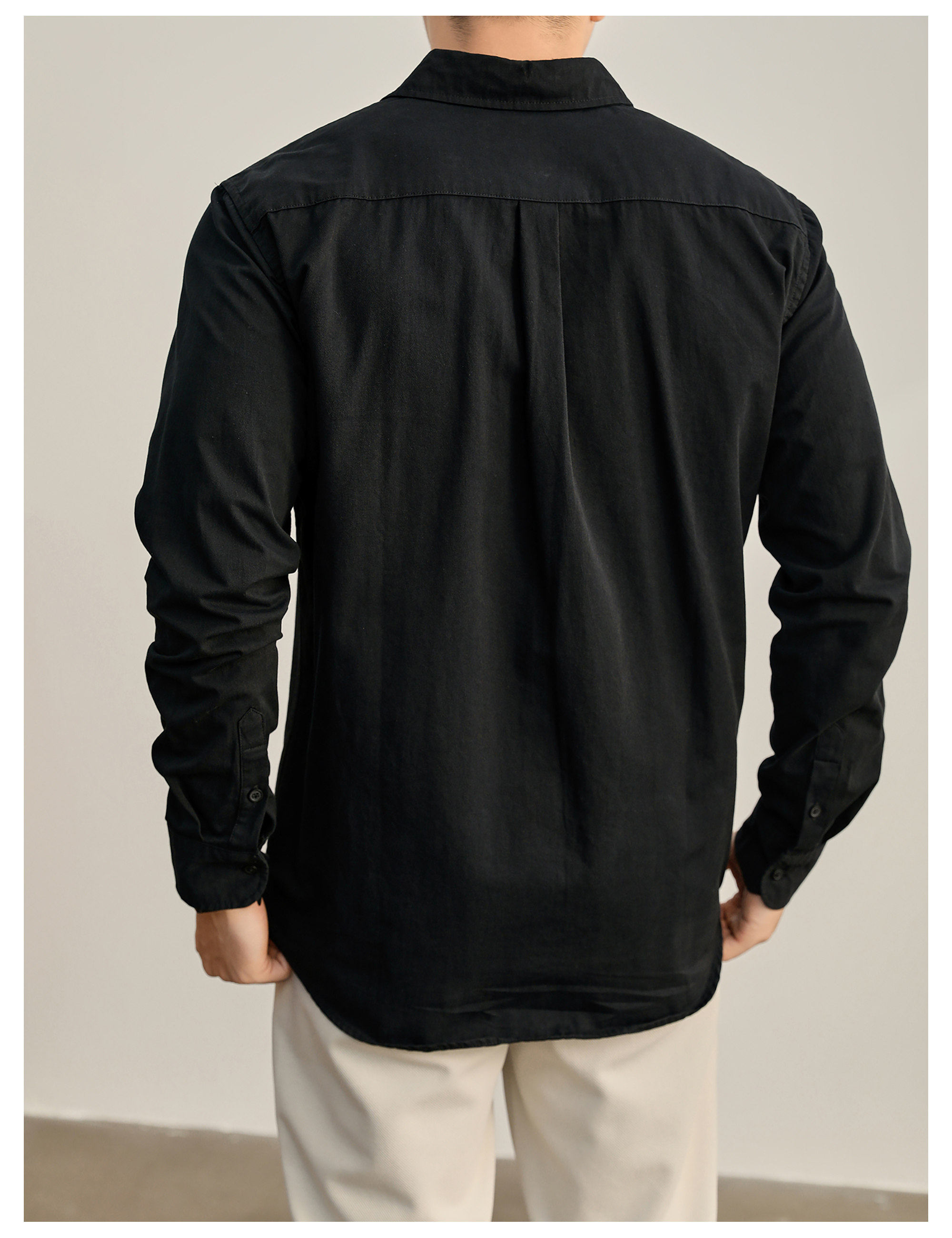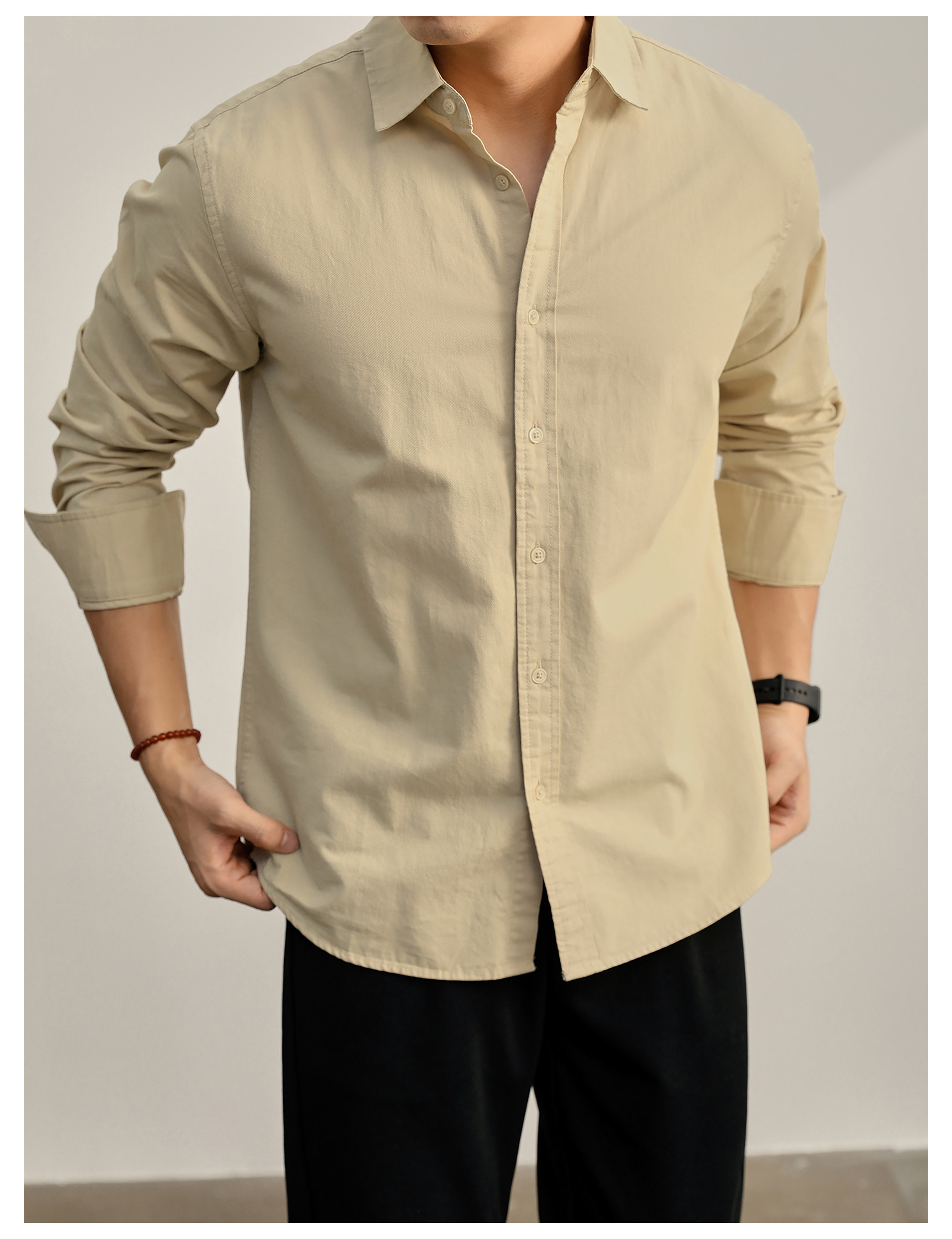高端韓版100%純棉翻領襯衫男秋季純色時尚百搭長袖寸衣外套