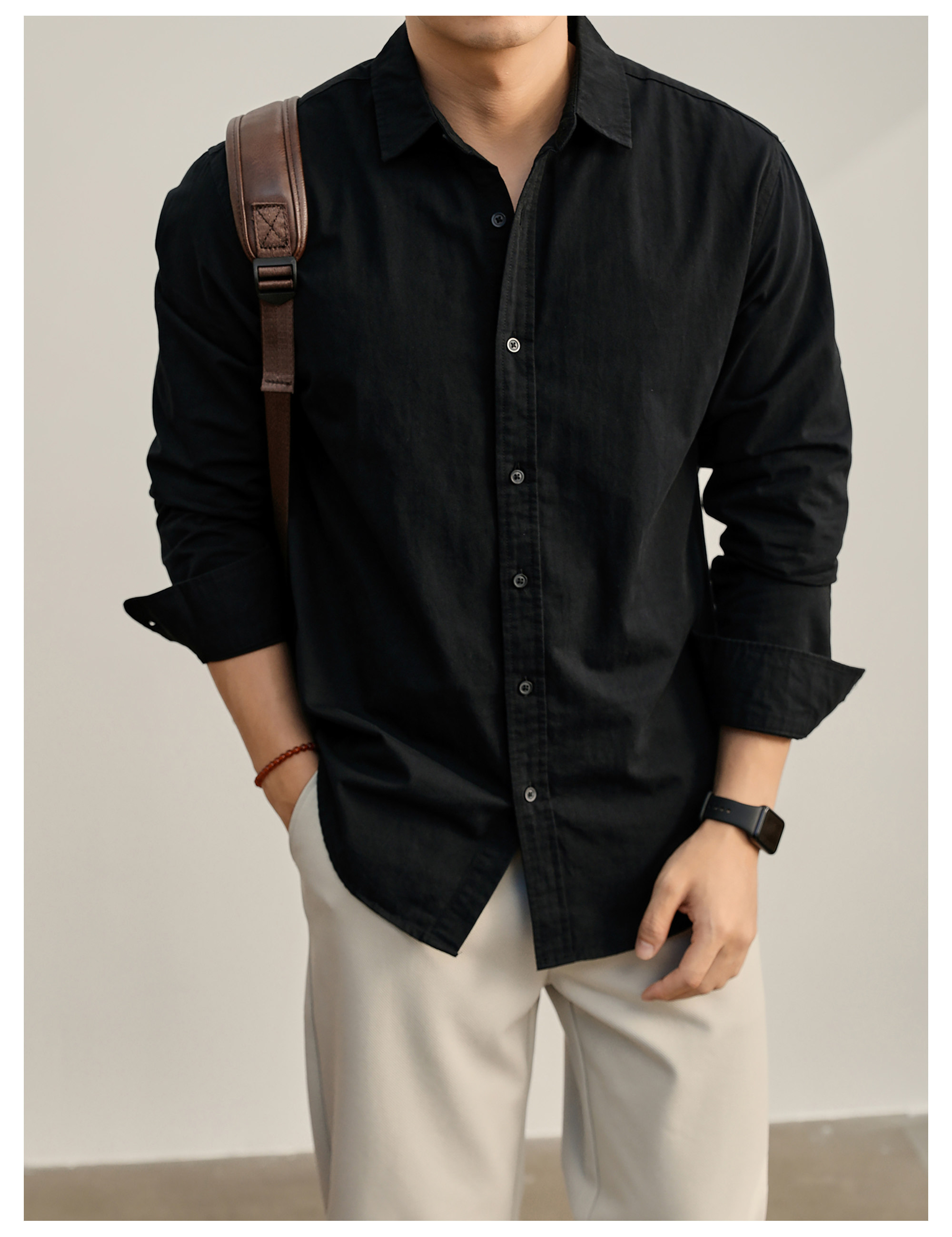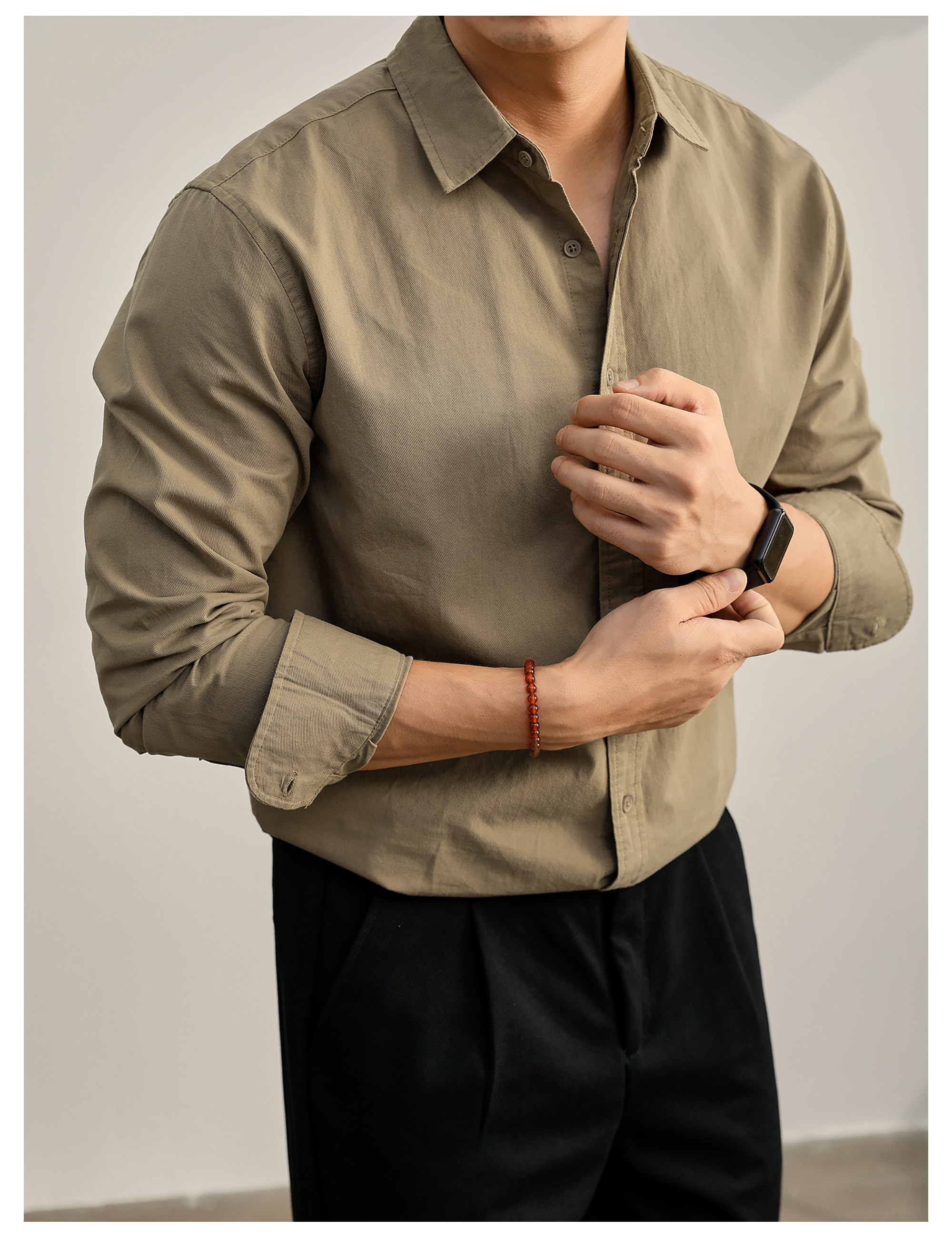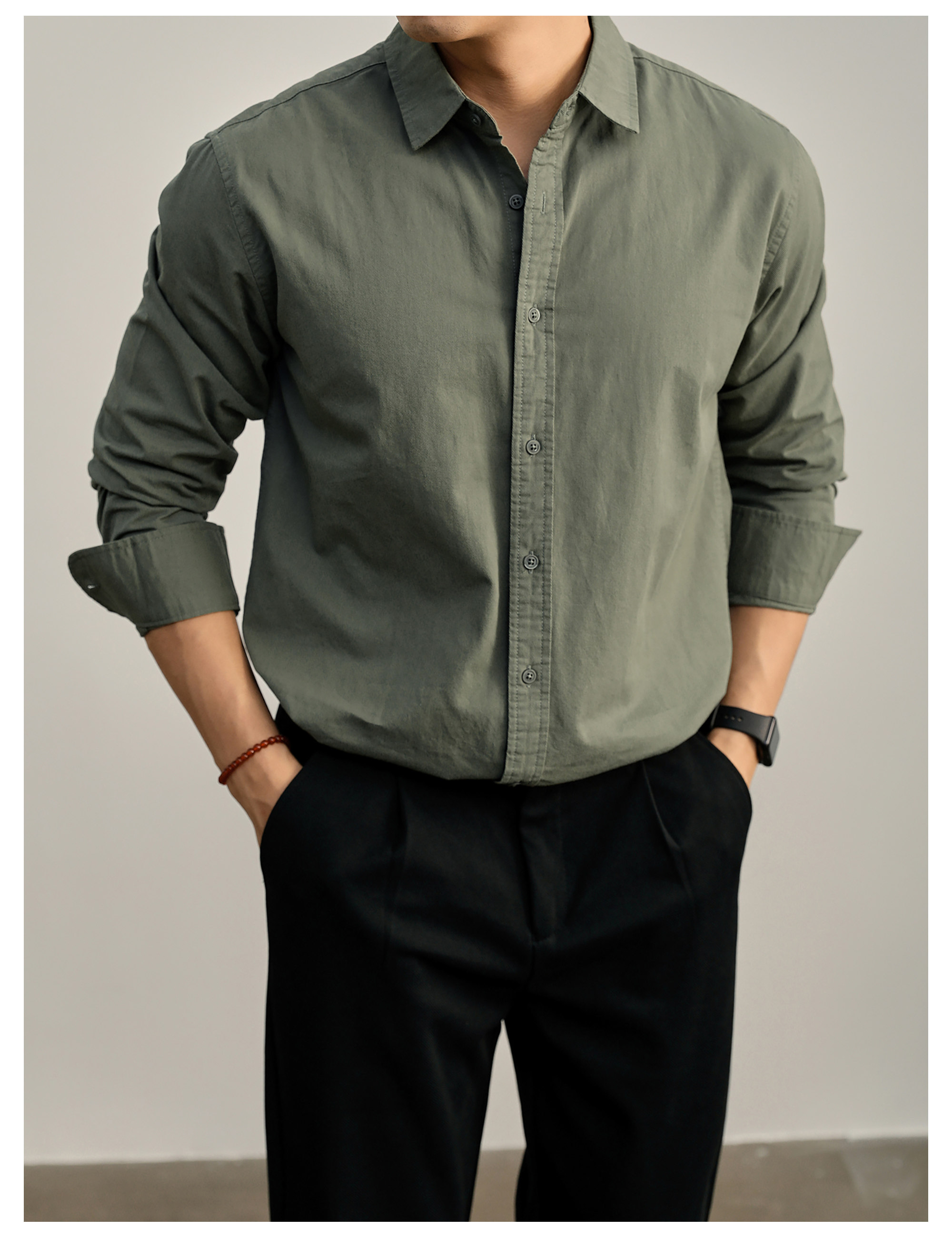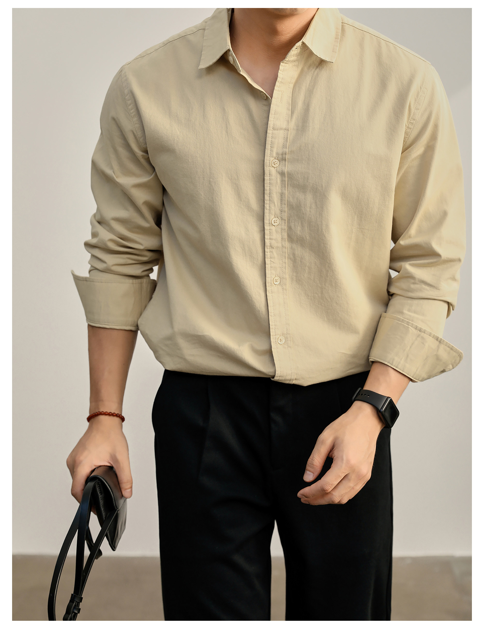 高端韓版100%純棉翻領襯衫男秋季純色時尚百搭長袖寸衣外套
