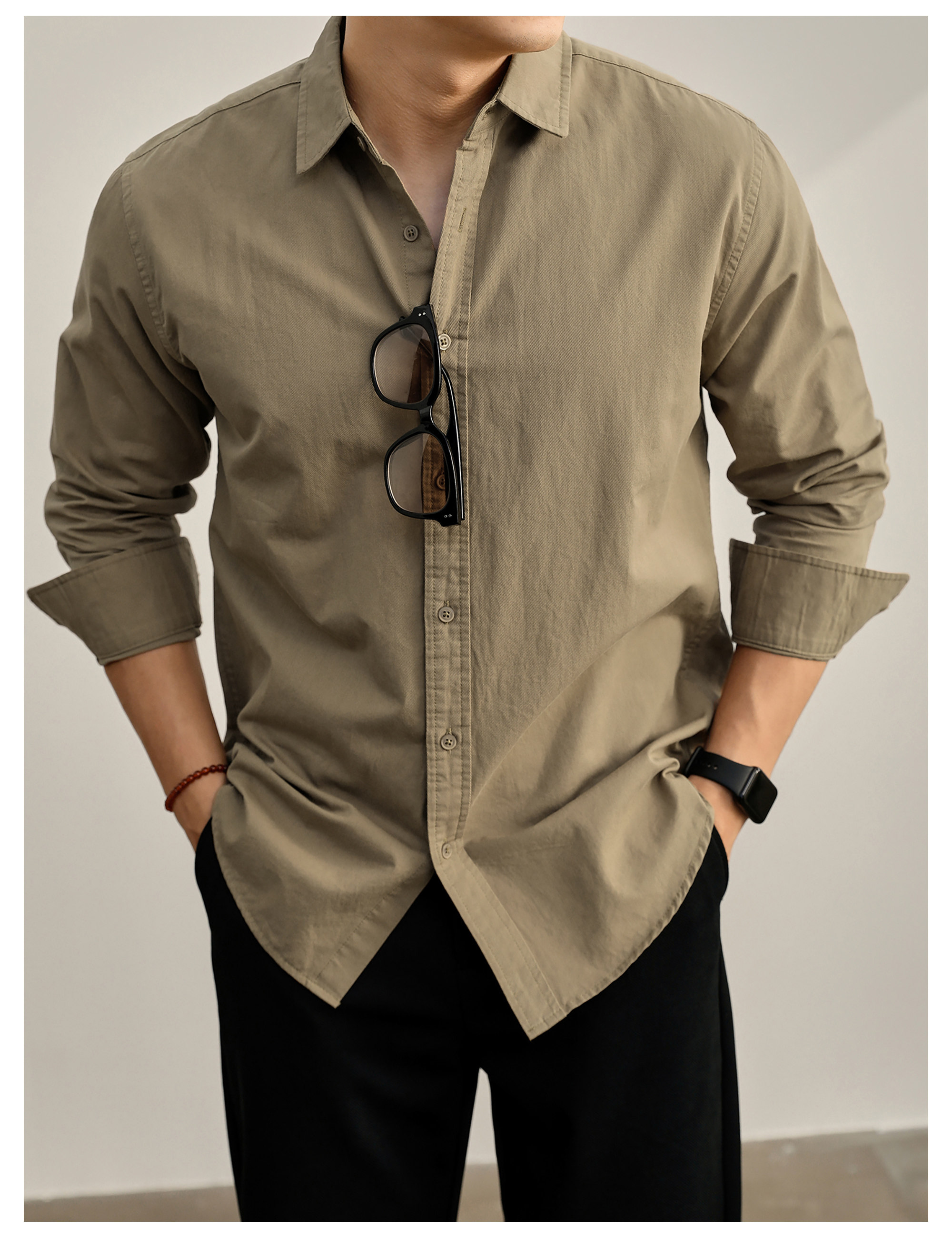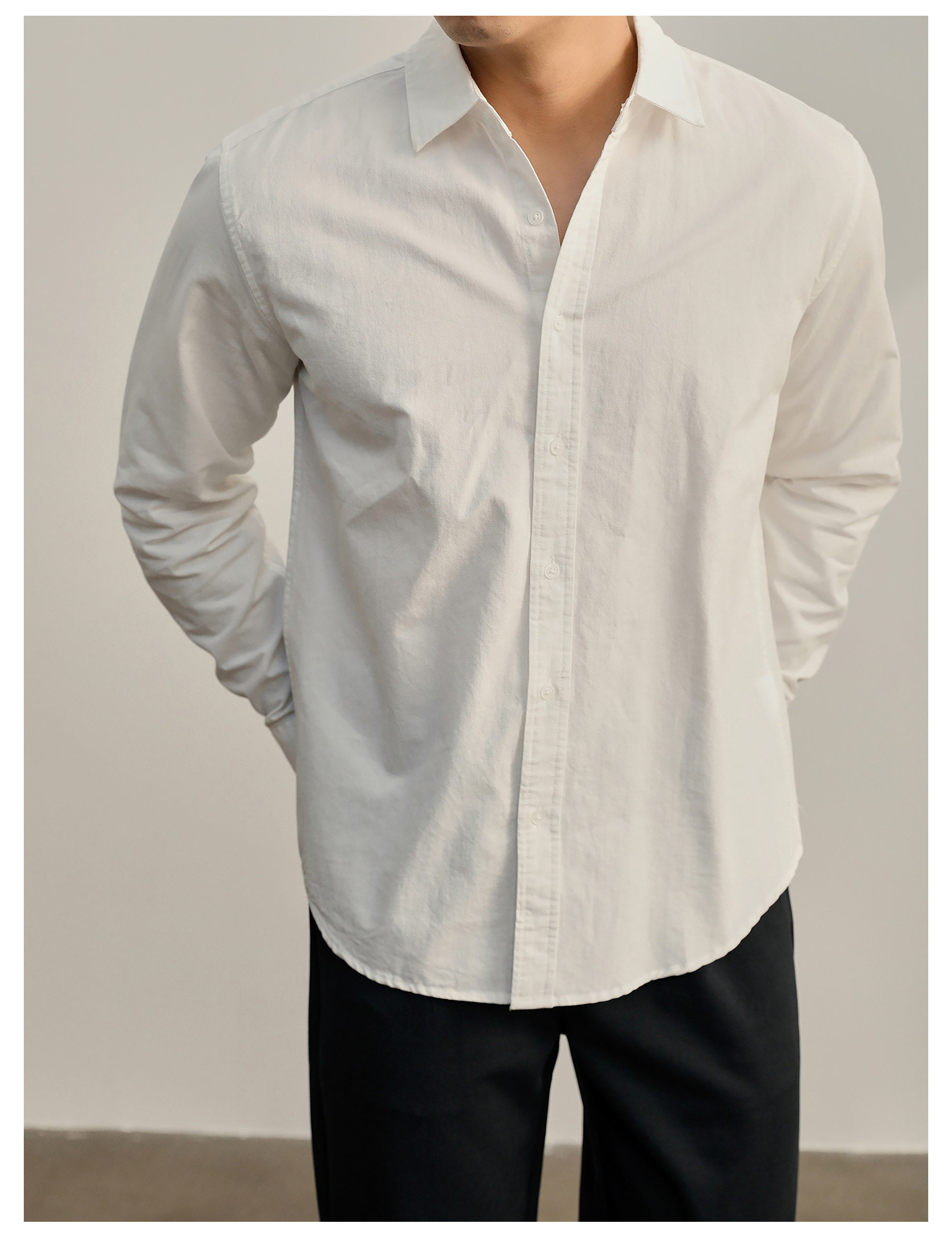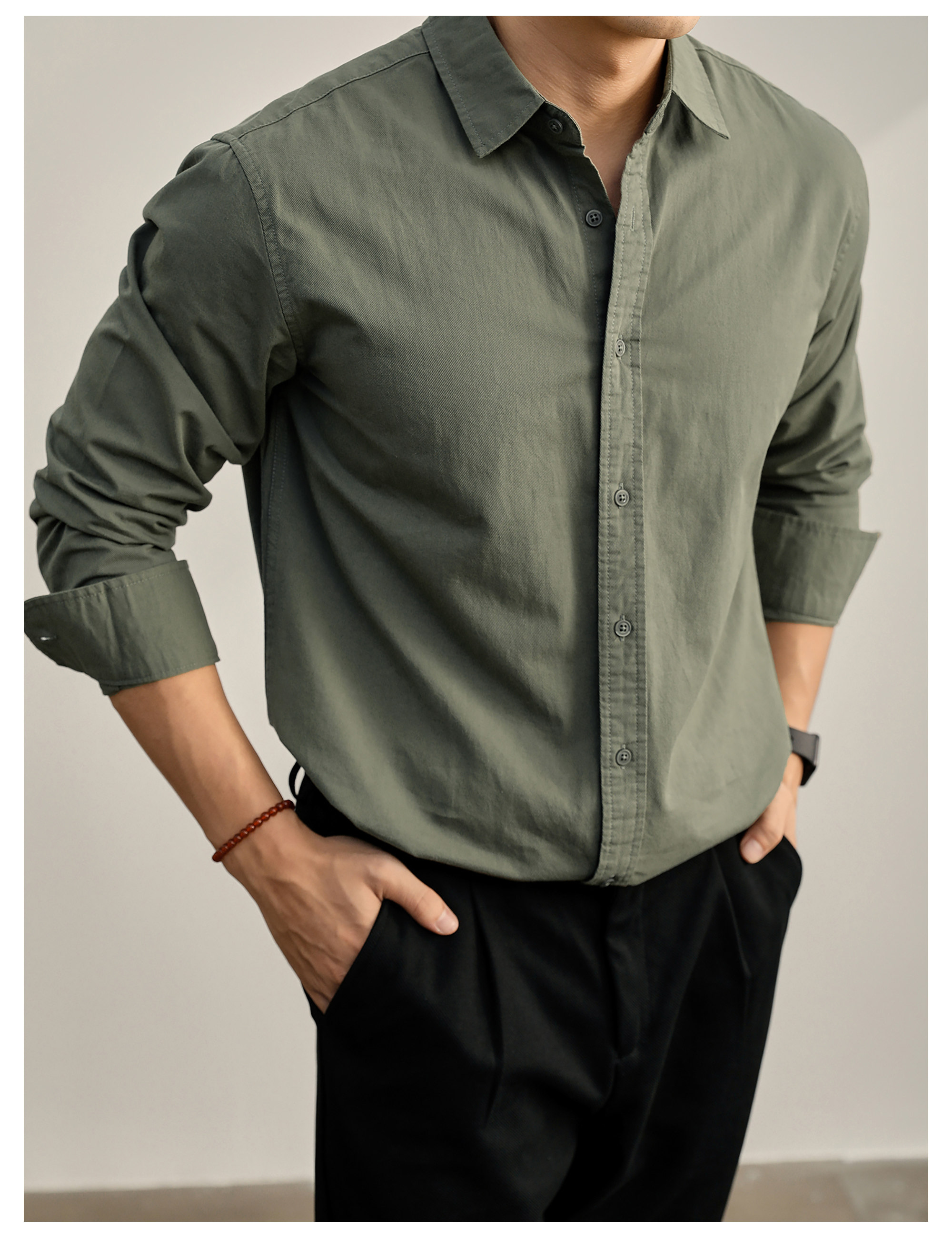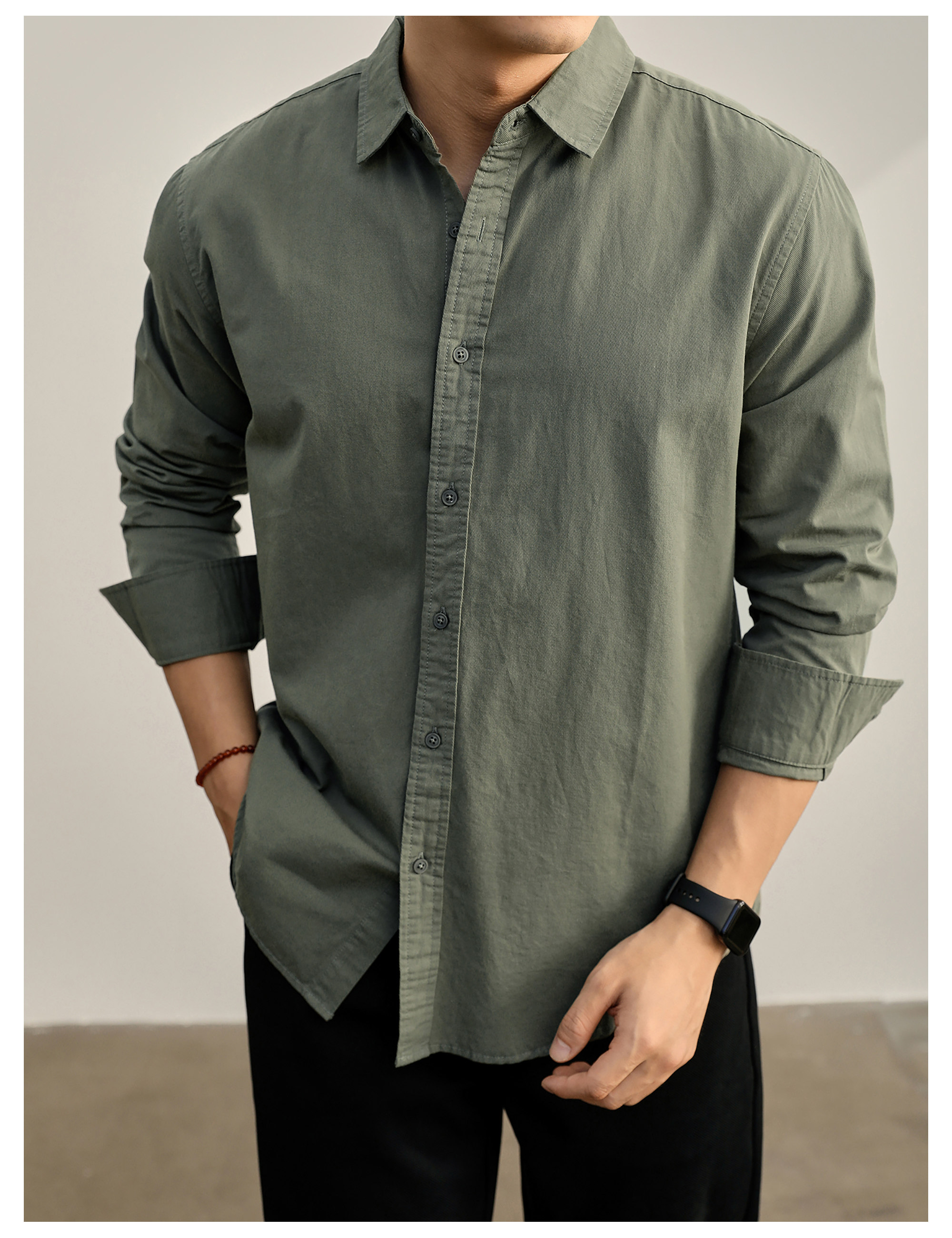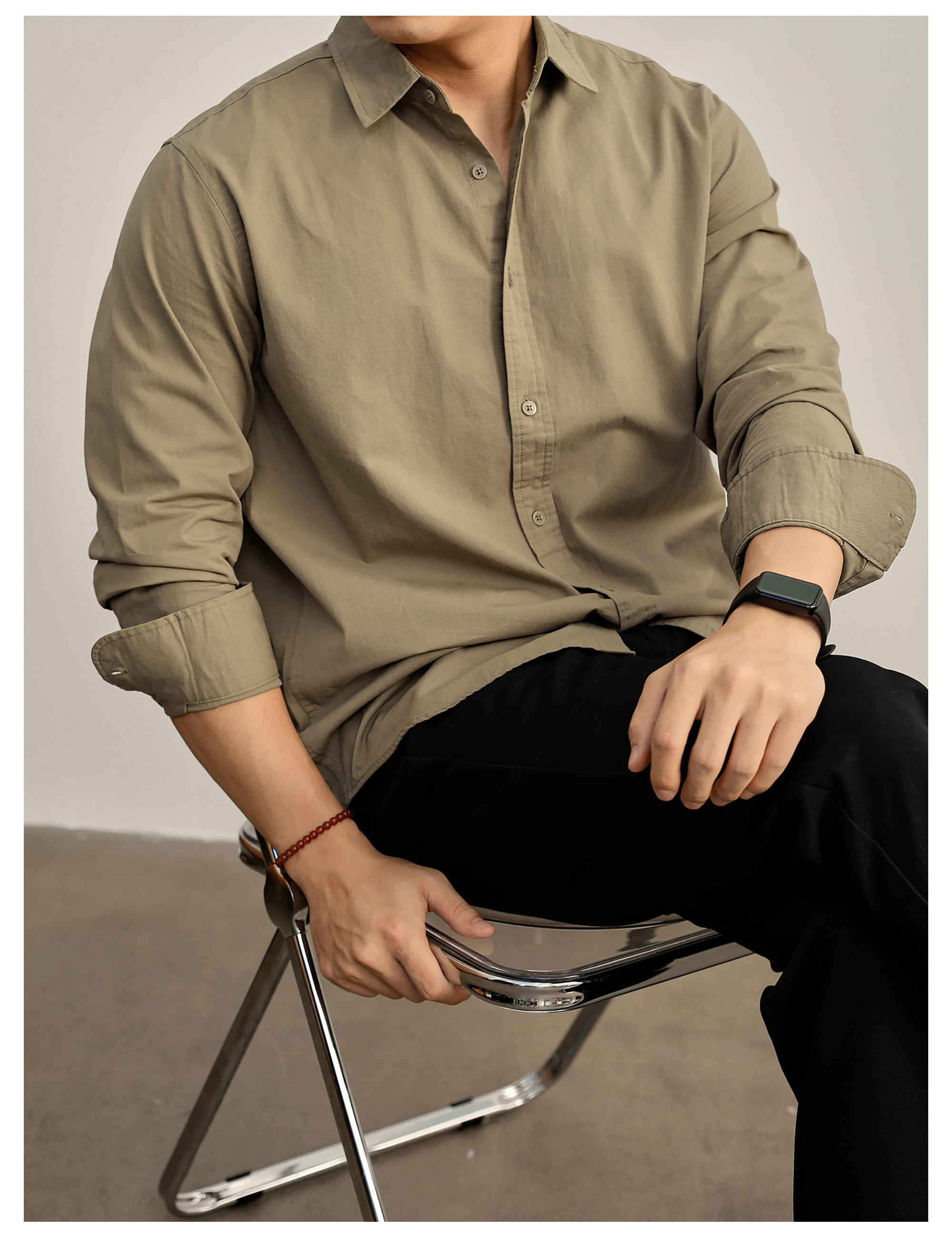 高端韓版100%純棉翻領襯衫男秋季純色時尚百搭長袖寸衣外套