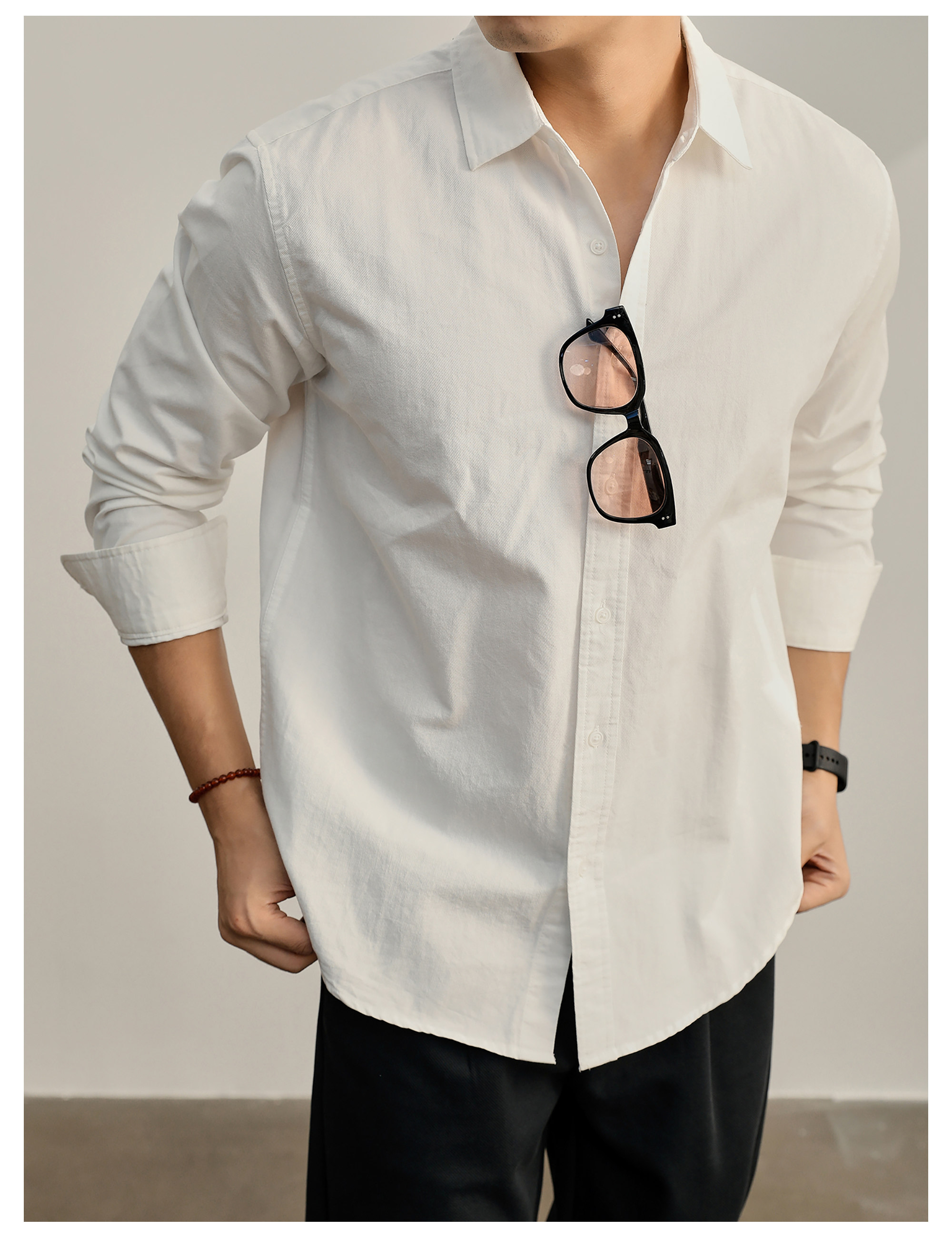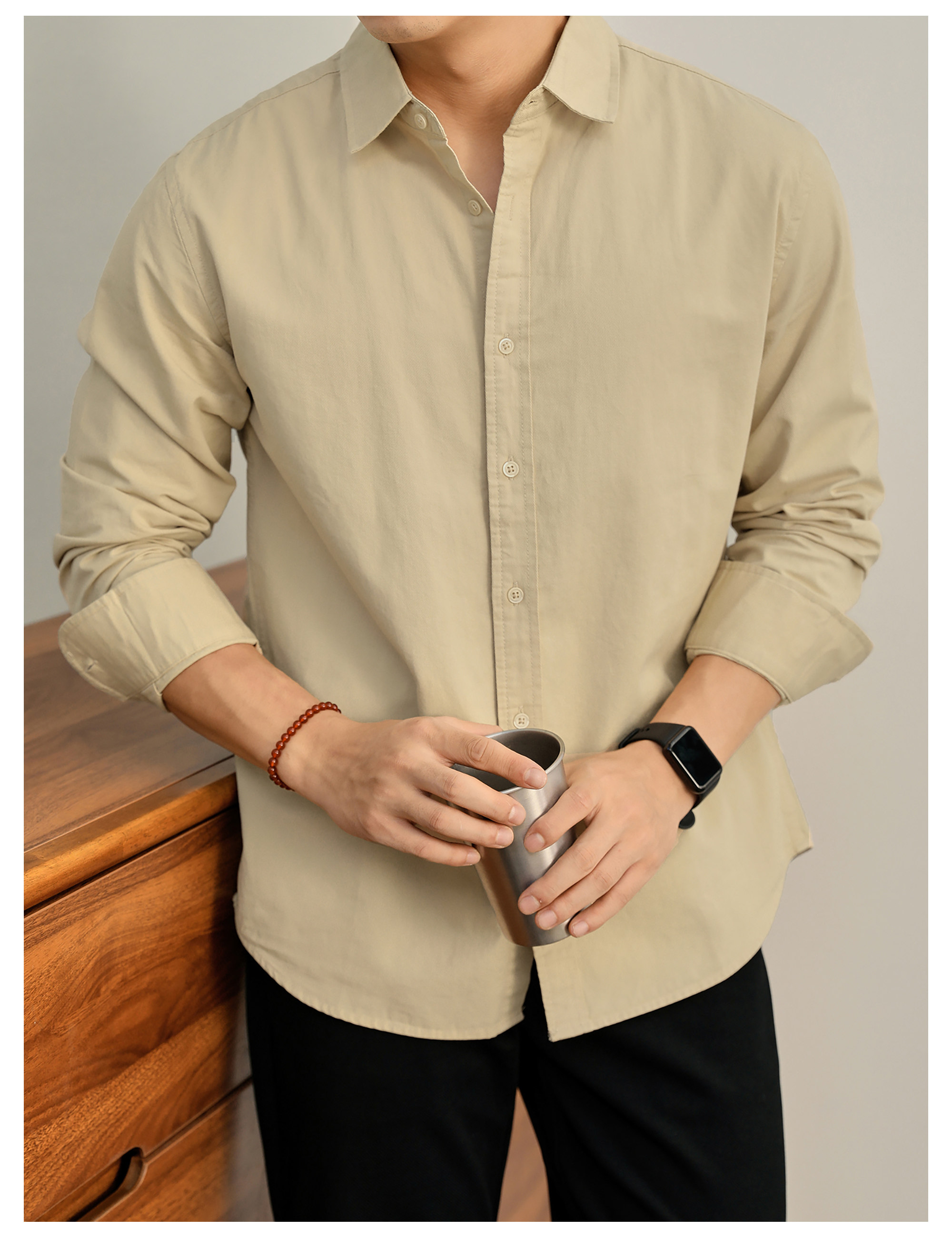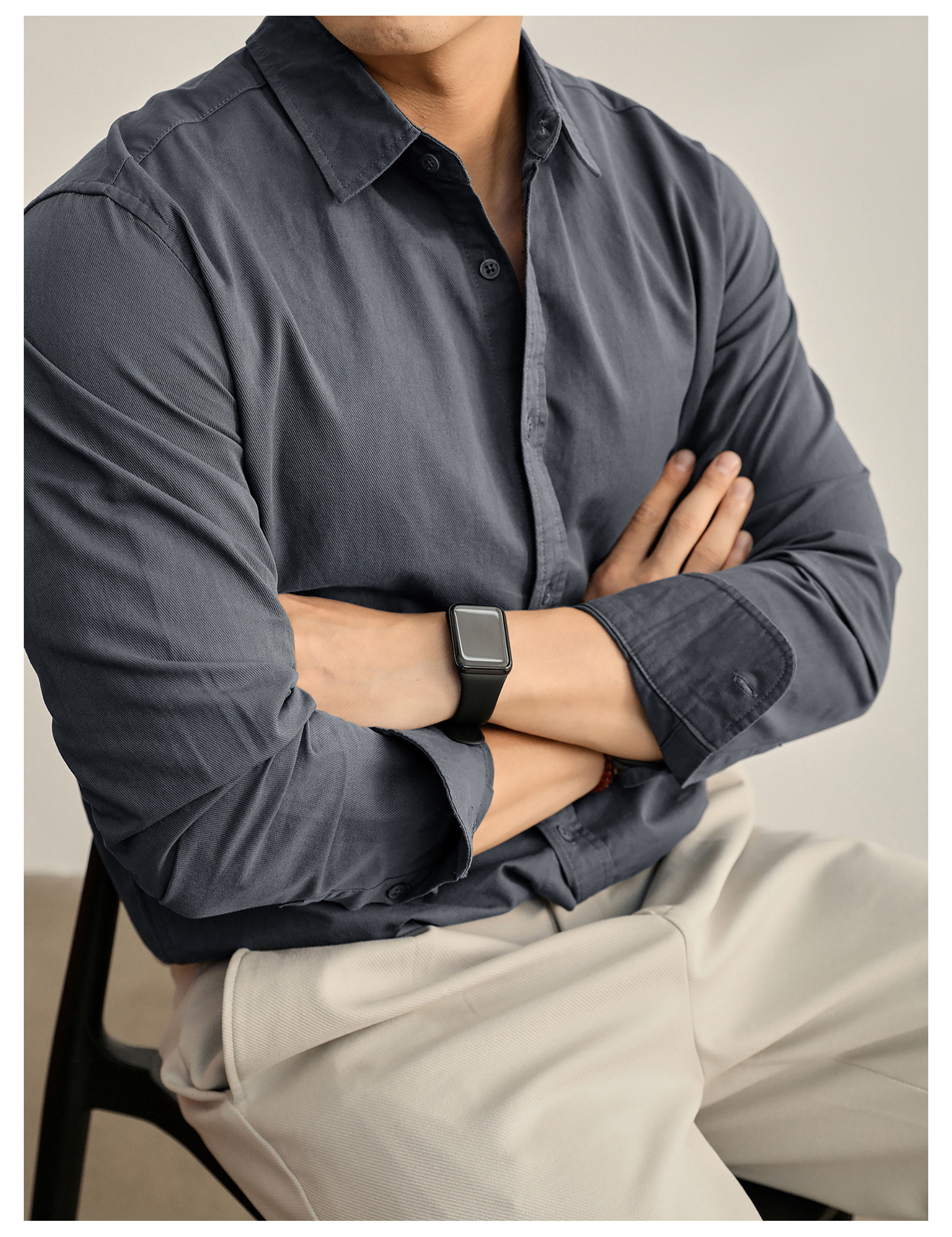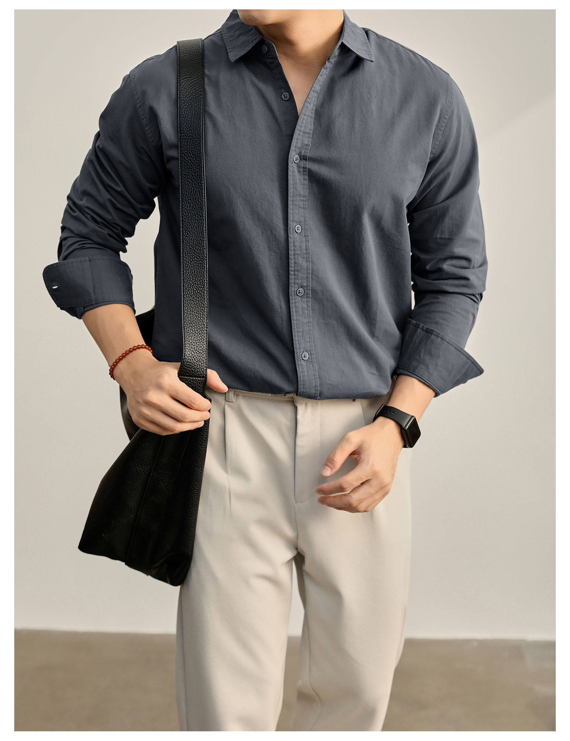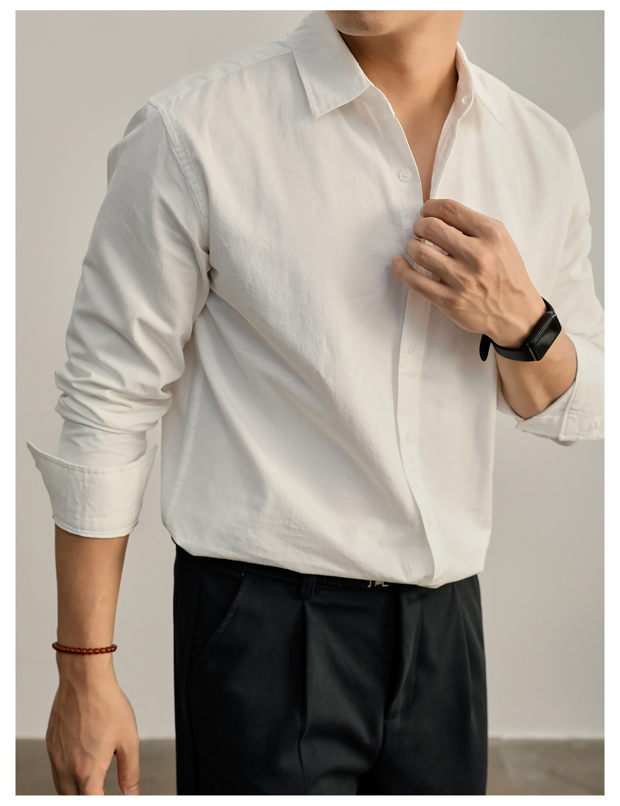 高端韓版100%純棉翻領襯衫男秋季純色時尚百搭長袖寸衣外套