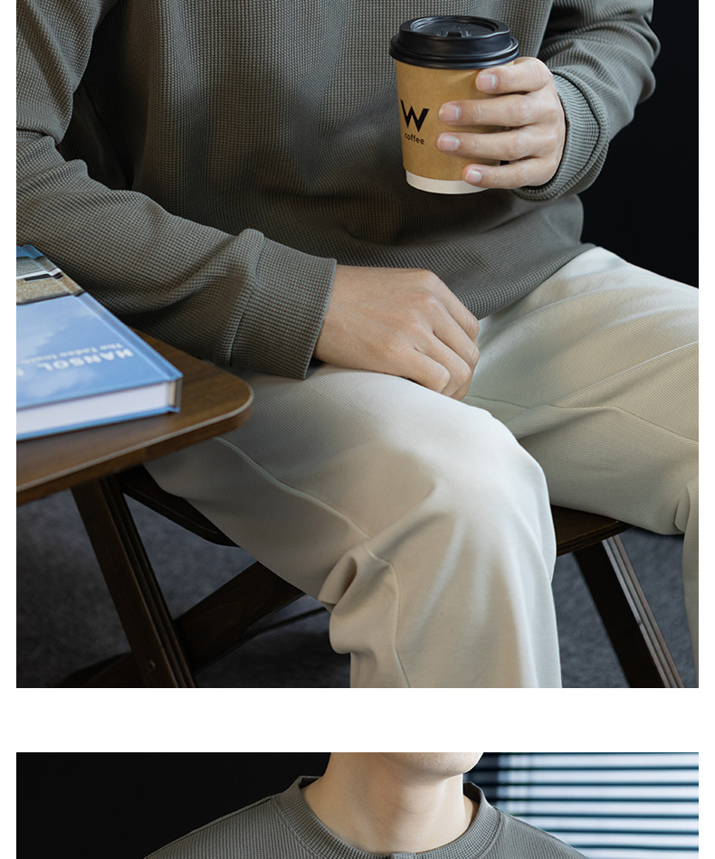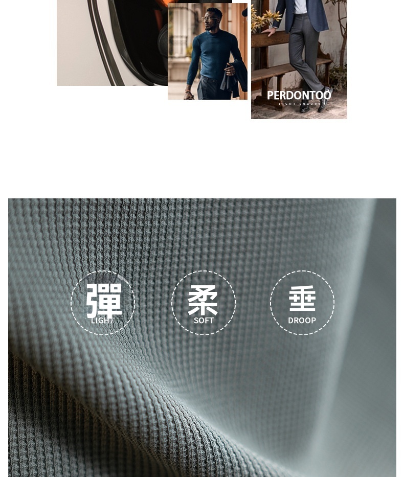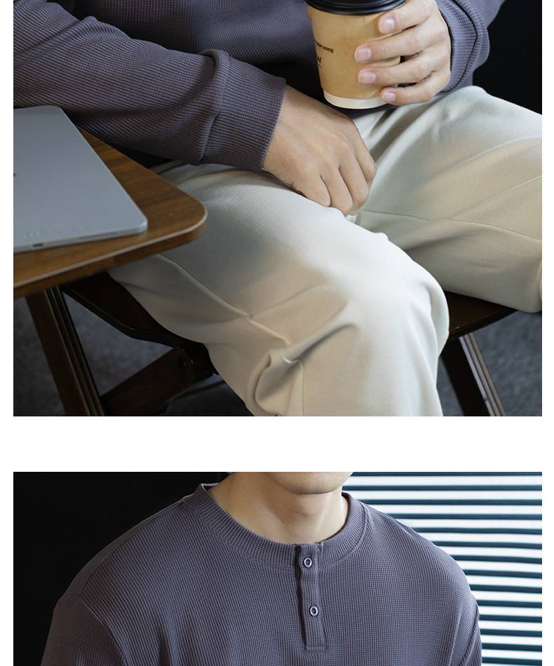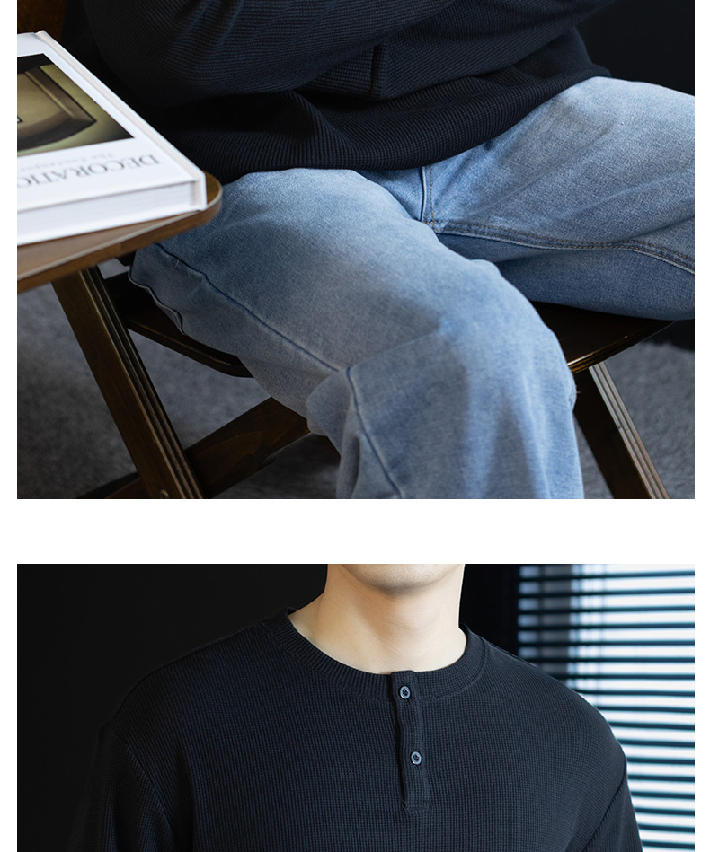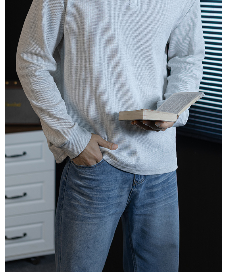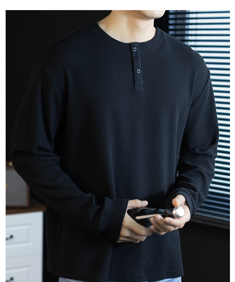 240G華夫格織紋透氣男士亨利領長袖T桖春秋商務復古寬鬆落肩上衣
